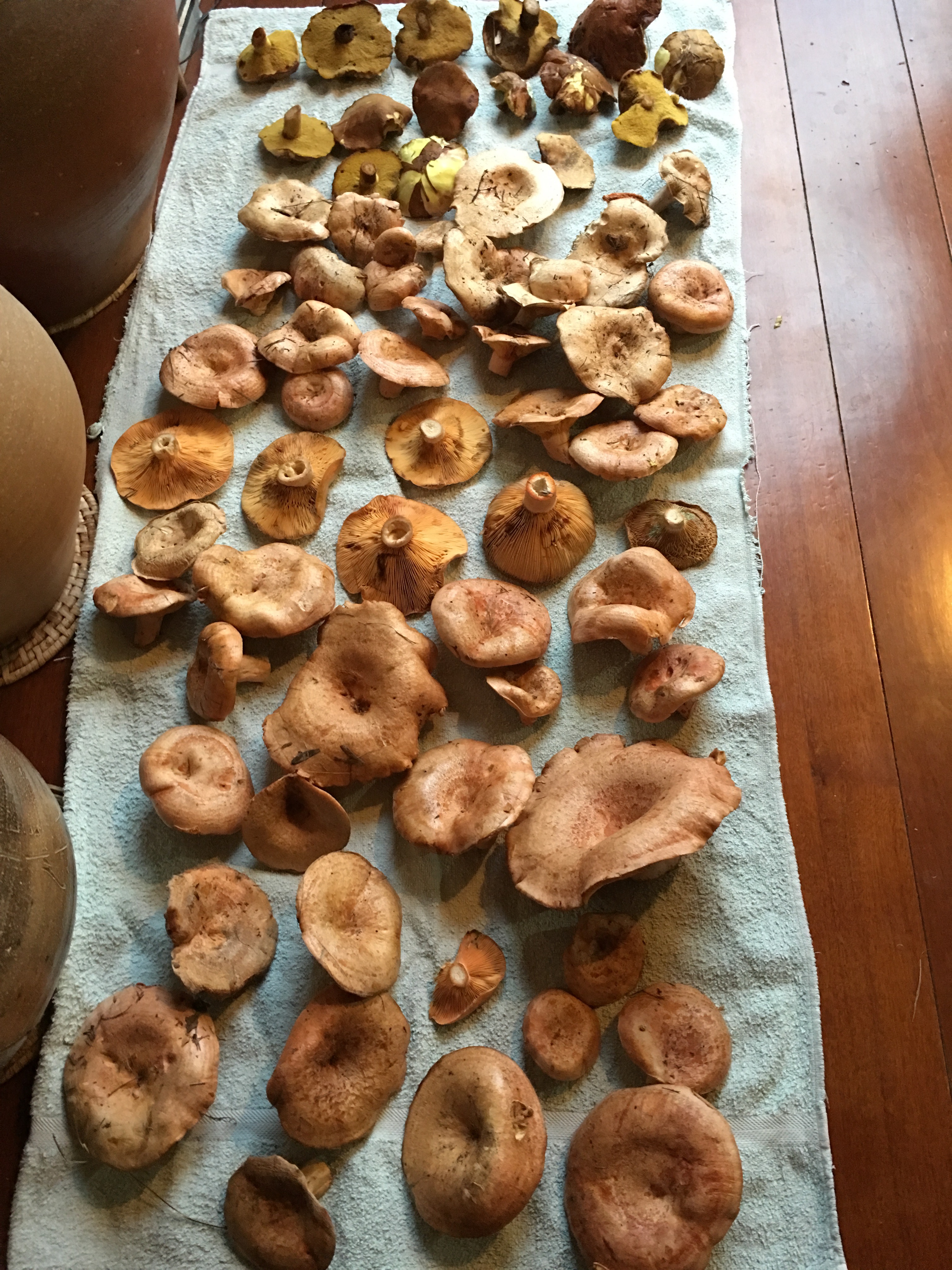 When I get home, Janine spreads out my bounty on a towel on the kitchen floor to stop them going mouldy. I need to peel and de-stem the slippery Jacks and slice them to aid the drying. The milk-caps will need some careful cleaning to remove all the grass and leaf-matter that is stuck to their tops. Luckily there has been no rain since they have emerged, so there is no splashed up dirt and sand stuck to their underside gills. That is always hard to spot and remove and results in some rather gritty and crunchy meals.