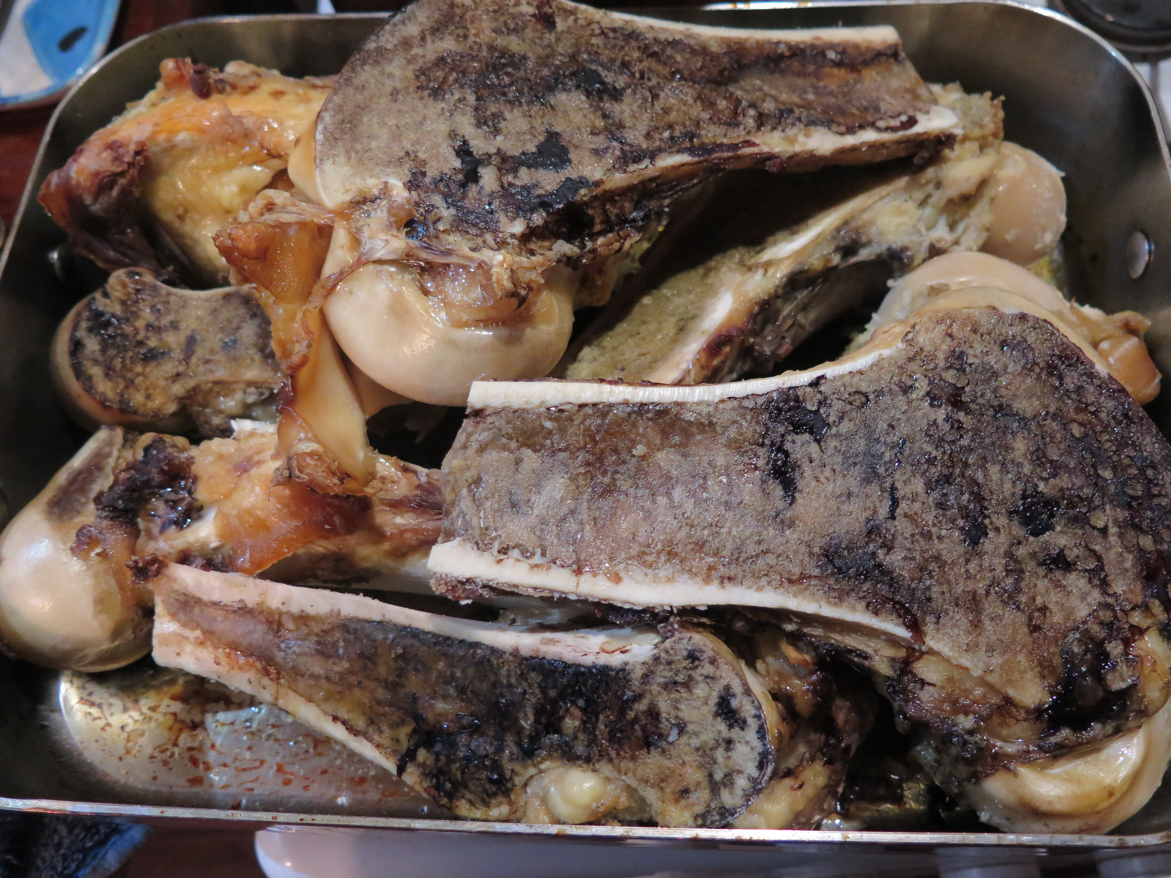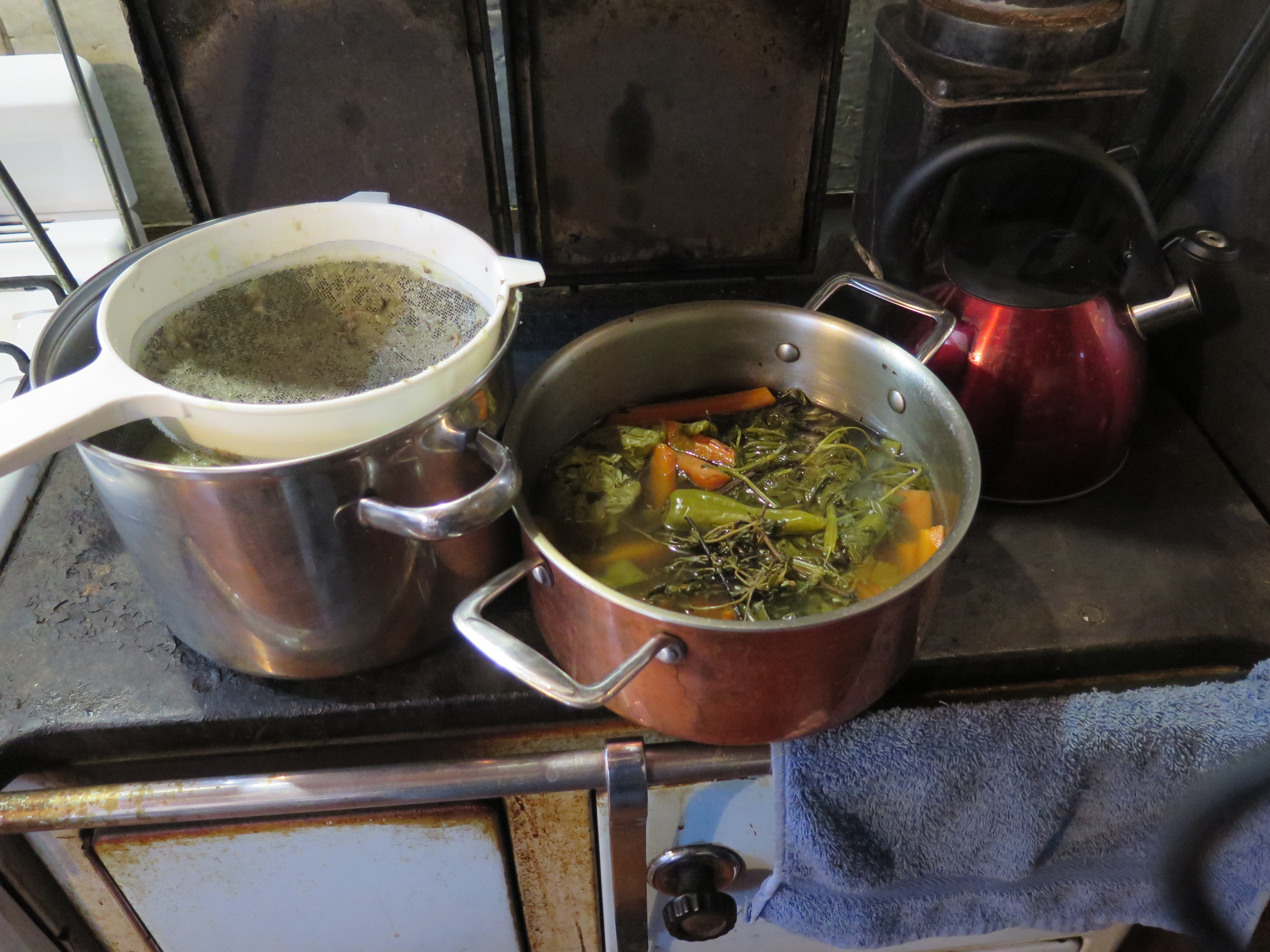 I have bought a couple of beef bones from our local butcher. He slices then lengthways and then in half to expose all the marrow. I roast the bones first in the oven for an hour to give them that slightly caramelised flavour. Then into the stock pot and covered with water to boil all through the evening and into the night. For as long as the stove is hot. I also put on a boiler of mixed vegetable and herb stock to simmer alongside the bones. I add all the usual things from the winter garden. An onion, a knob of garlic some thyme and oregano, bay leaves, a few whole pepper corns, a 5star anise, some chilli and a couple of capsicums that are still lingering in a warm spot. Even a small wild cabbage. This is not a gourmet stock, made from all the best, most perfect ingredients like pristine onions, carrots and celery, for some posh restaurant. This is peasant food. Post modern peasant food, We are practising self-reliance, so this is a case of using what we have in the garden at the time, in true peasant fashion. Ever time I make a stock it is different, depending on what there is in the garden that needs to be used up now or it will be wasted.