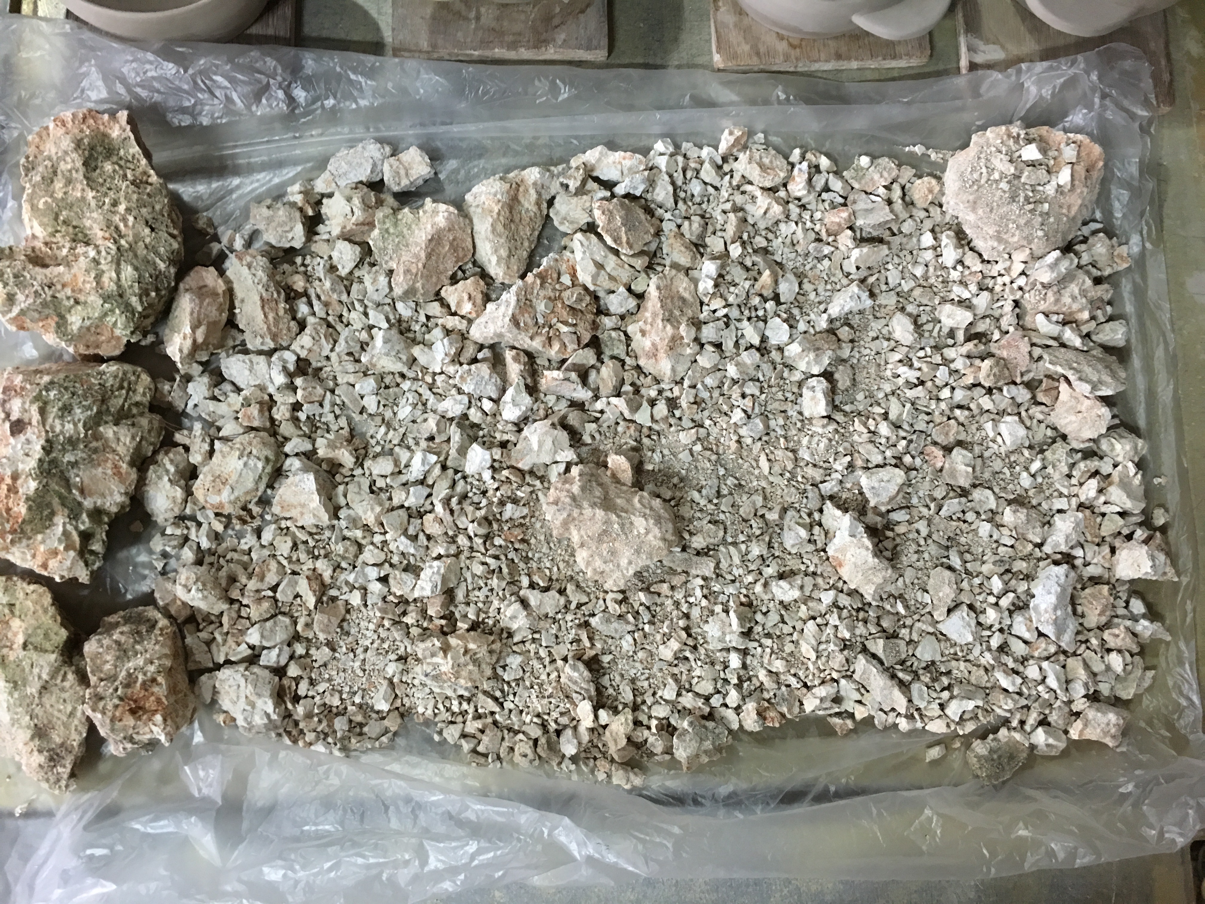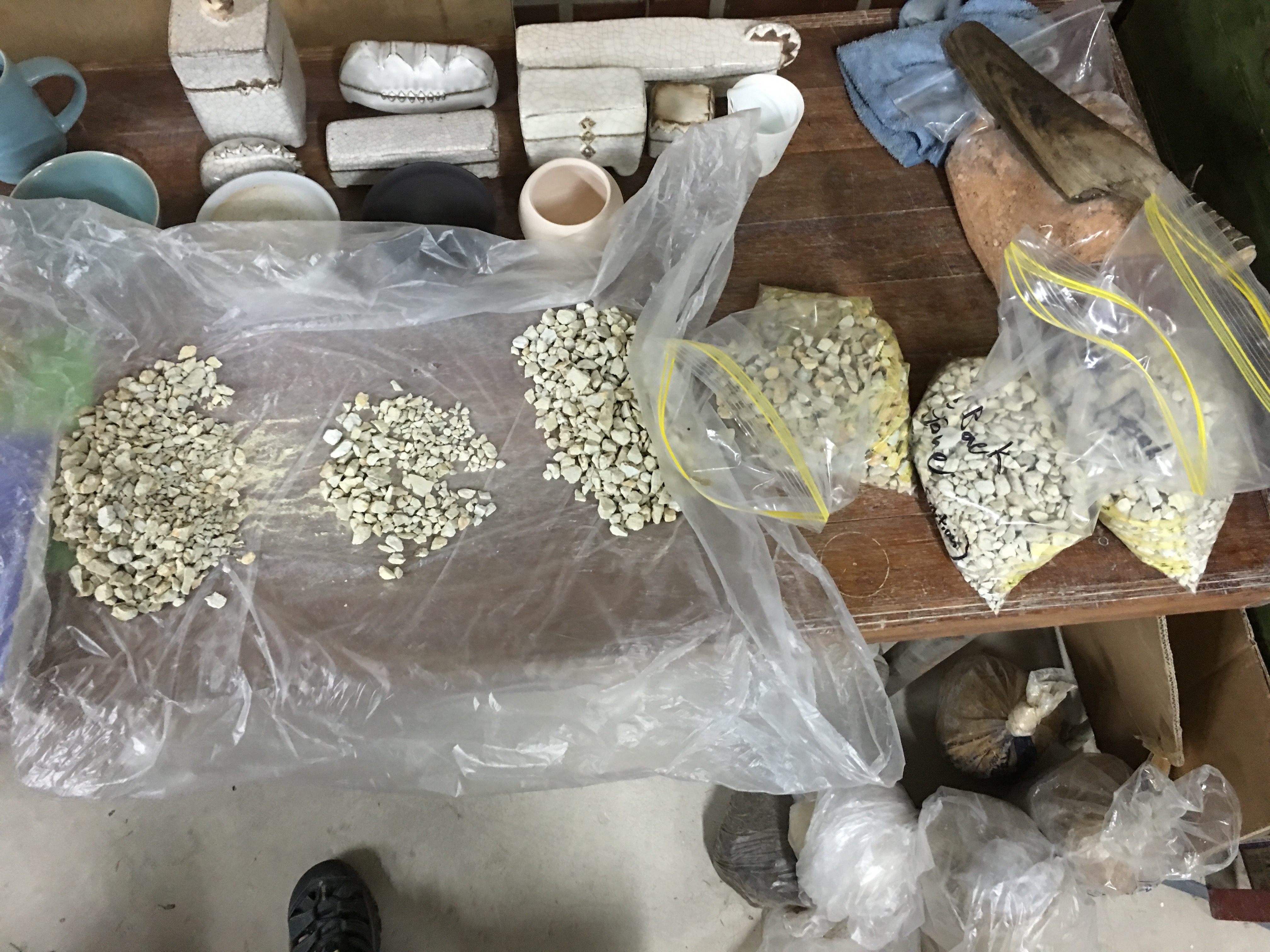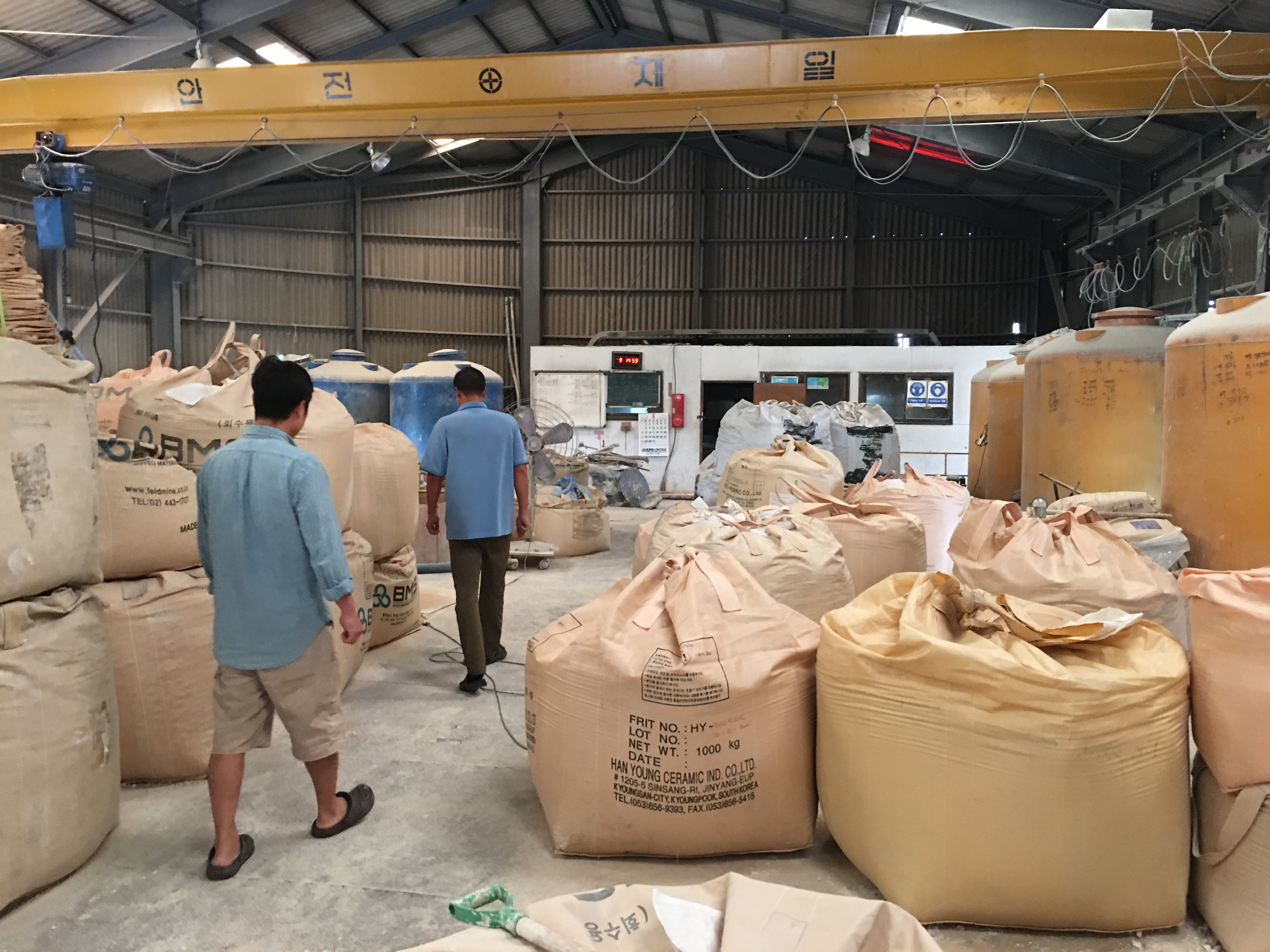 We fill a couple of bags with nice pieces and then My Jung drives us to the clay making facility. It is very modern collection of machinery. The crusher is completely enclosed in a plastic sheeted room of its own to control the dust. Then there is the ball mill, slip tanks, electro-magnets, slip storage, filter press, vacuum pug-mill and then the bagging area and stored to age, ready for use. It’s an enviable clay-making piece of kit. It is sort of what I have, it’s just that mine is in micro, compared to this, and all my gear is home made or bought second hand when I was lucky enough to see it up for sale. Small, laboratory sized crushing equipment doesn’t come up on the market very often in Australia. I have spent a life time of opportunistic scavenging to get all my equipment together in my shed. Then of course there is the expense. I had to do all of this on a shoe string budget. Thats probably the main reason that it has taken me 40 years to get it all assembled. This, on the other hand, is a purpose built shed and all brand new machinery. Oh for a budget like this!