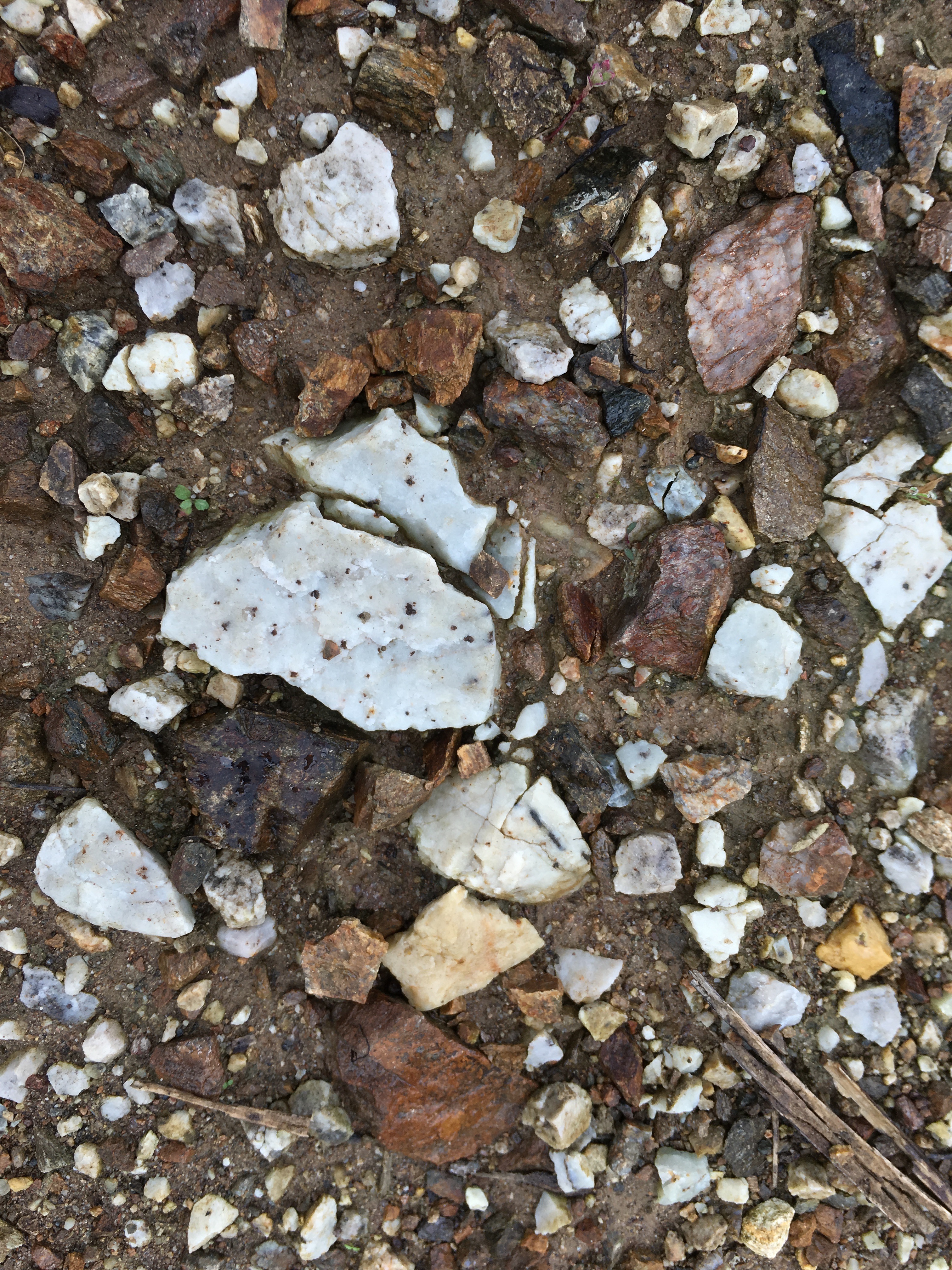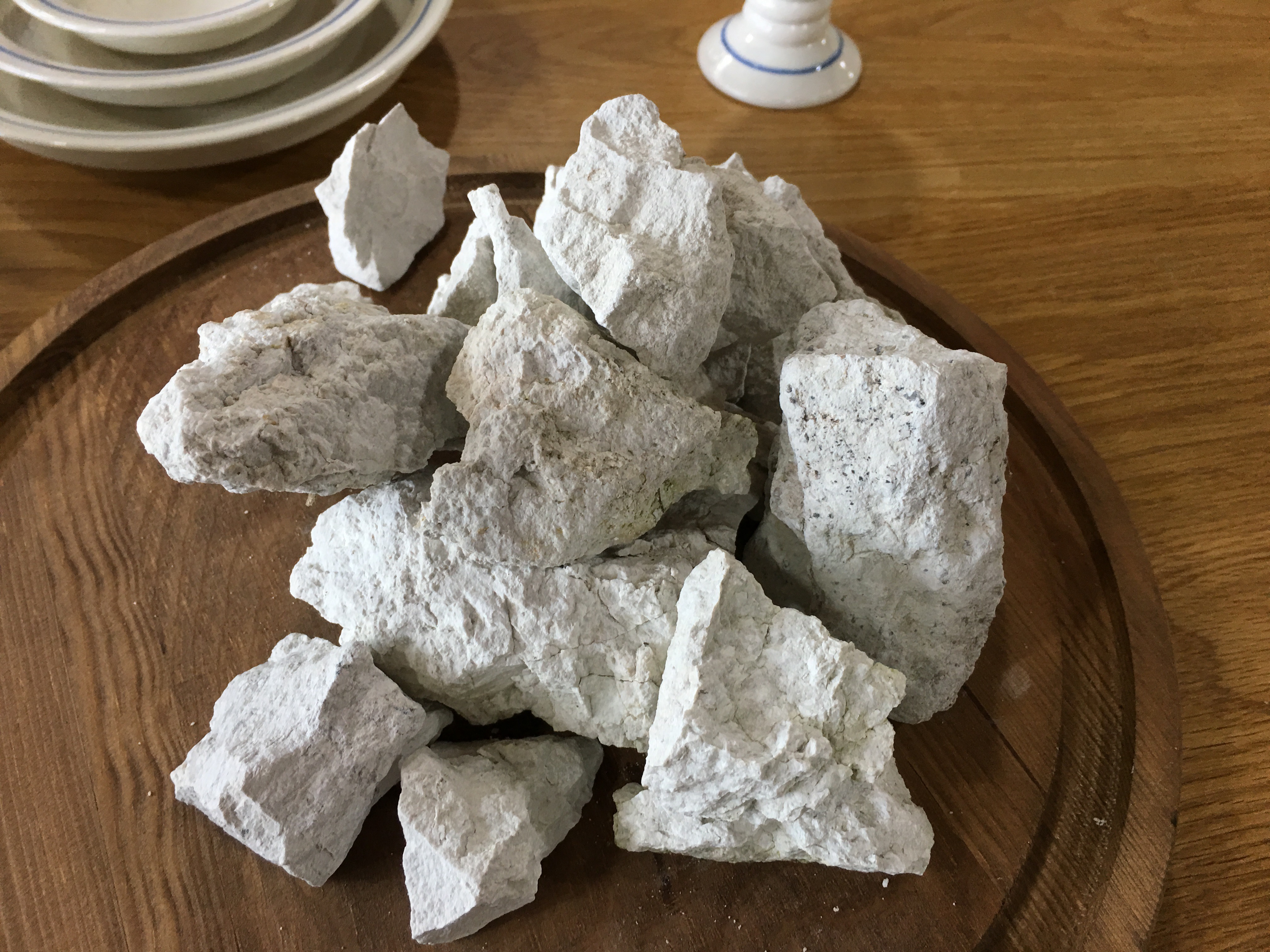 While they are talking, My eyes wander around the office. A few porcelain pots on a shelf, some old-looking shards on another. A book-case full with journals and magazines. Then right next to me on the shelf by my shoulder I see 3 large white lumps of porcelain stone. One of them is iron stained along the fracture cracks by water staining. A man after my own heart.