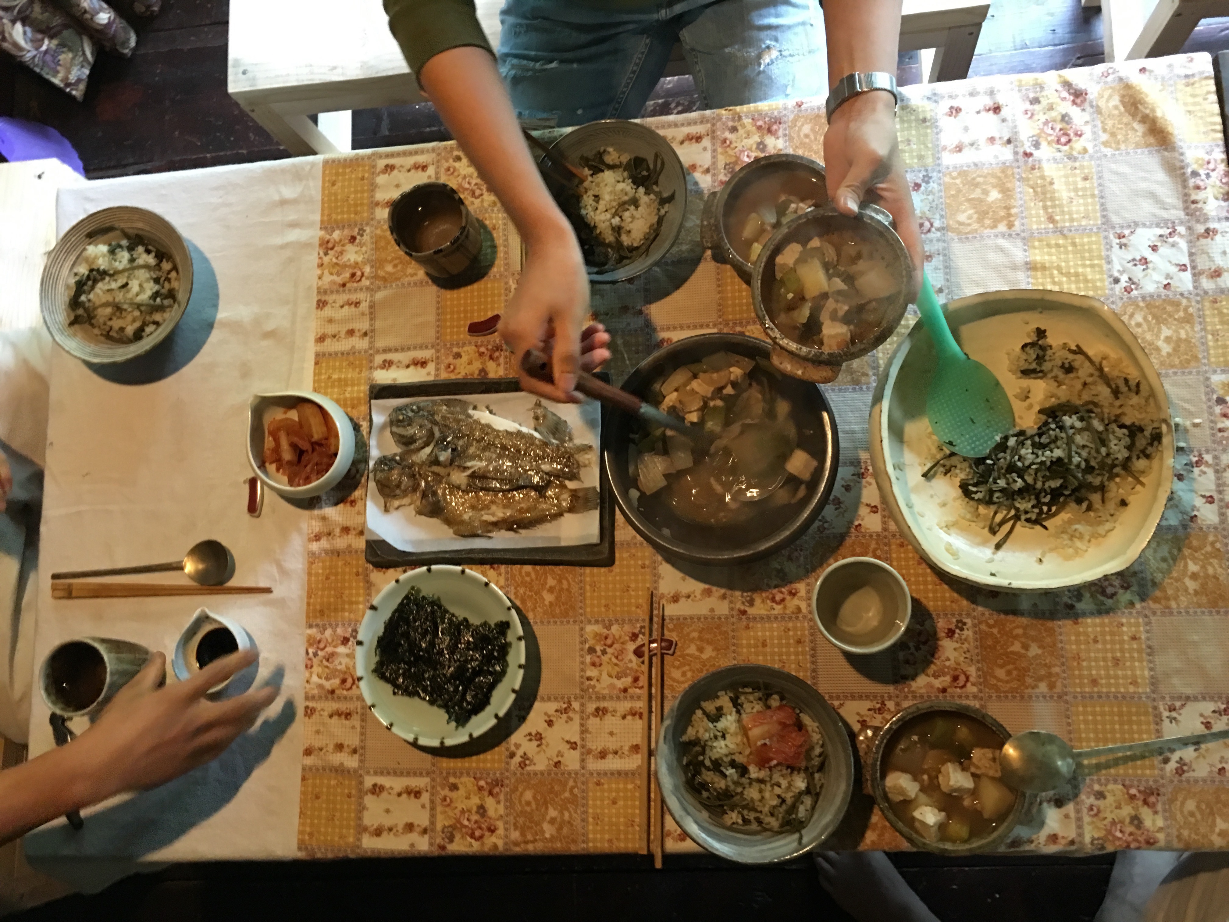 I finish my throwing and take Miss Kang to dinner, she selects a local place that is only walking distance away. It has been recommended by Mr. Jung. We go and it is very nice. The usual fare of a bowl of rice each, a dish of soup to share, served along with several small dishes of pickles and other vegetables. It all looks really delicious. I can’t help taking a photo with my phone. I look up and see that Miss Kang is taking a photo of me, taking a photo of the food. We both laugh.