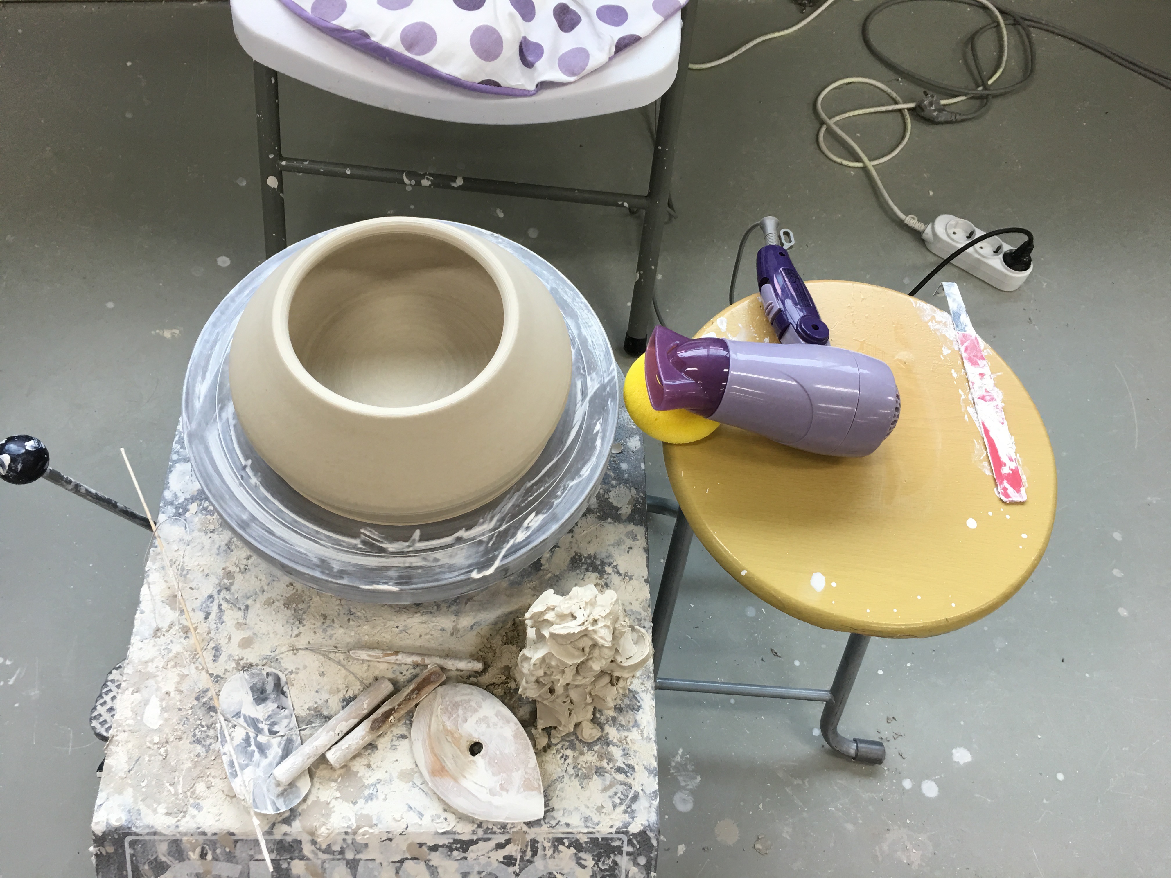 We drive back to the Museum via the 24 hr. convenience store for a coffee and I start drying my pots with a hair dryer, then a heat gun appears and I use both to dry the heaviest of my chucks first, so that I can get started with the trimming. It all goes pretty well.