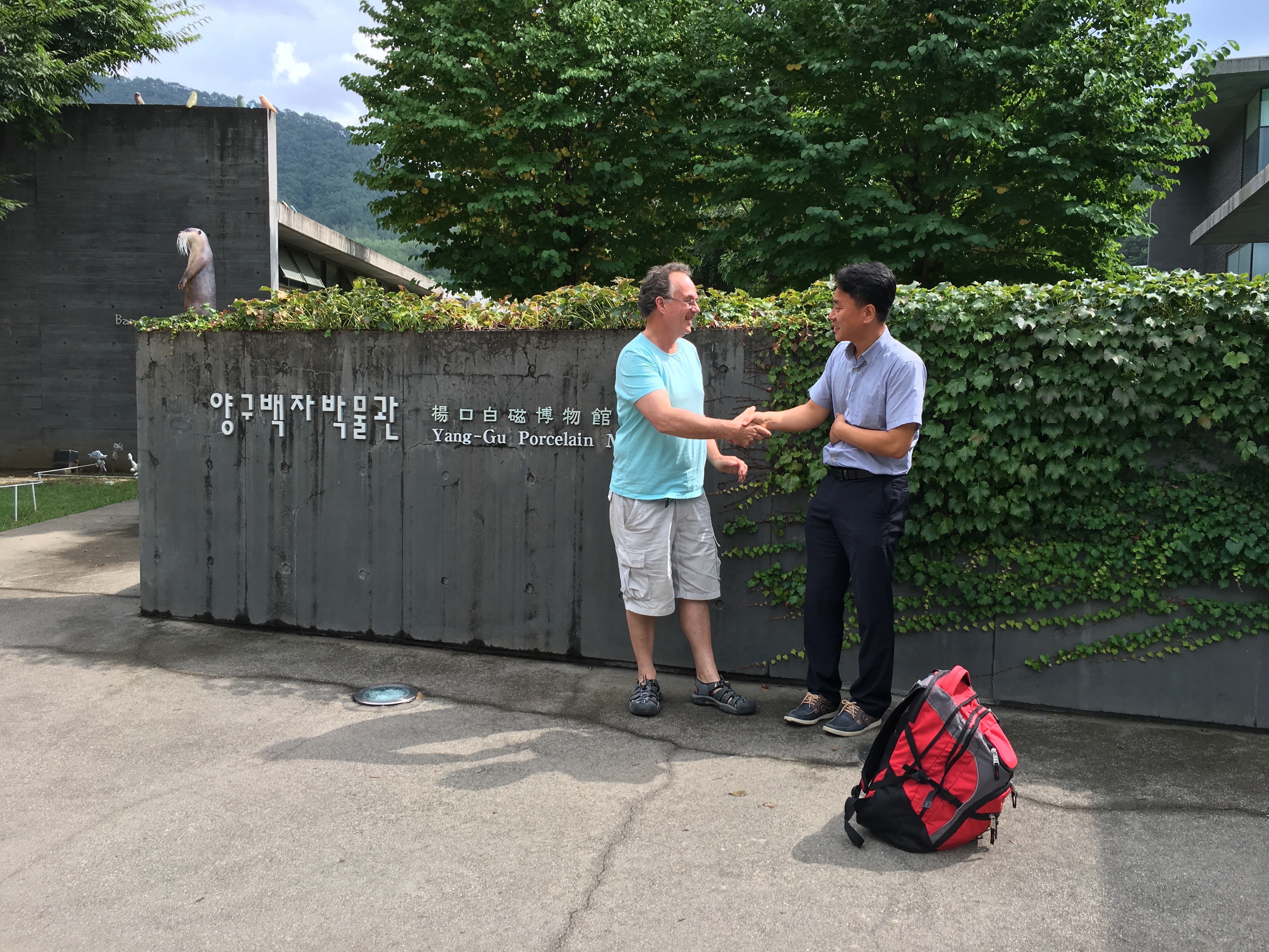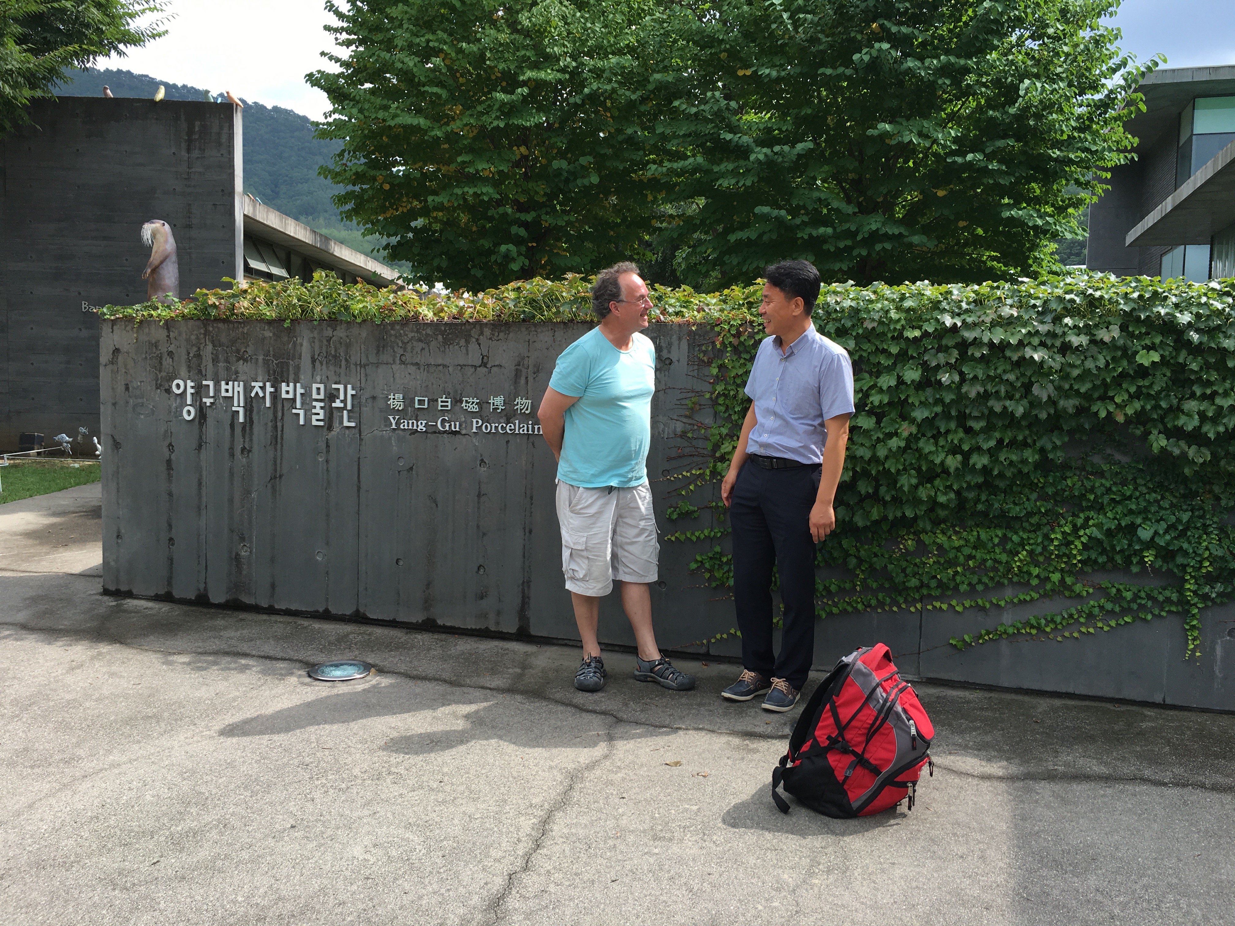 Miss Kang is addressing me now. I return my gaze to The Man. He is apparently the Museum Director. He is interested to know more about my project and my intended exhibition. I explain to him through the medium of Miss Kang, that there are 5 countries in the world where I know that porcelain was invented independently. There may be others, but this is what I know. I have been to each of these places and worked on-site to make porcelain pots there and intend to have an exhibition of ‘5 Stones’ in Sydney in 2017. He listens blankly at first, then smiles and tells me that he is also collecting samples of every porcelain stone. Where are my five sites located. I tell him that I have been to China, Japan, Cornwall and now Korea. That’s only 4 he comments. I tell him that there is also Australia. He smiles. “I didn’t know that there was any porcelain stone in Australia!” There is, I tell him, because I have used it to make my own native, single-stone, local porcelain. He looks at me a little bit surprised.