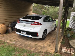 The Hyundai Ioniq electric car is available in 3 models. Fully electric, Normal hybrid (like a Toyota Prius), and a plug-in hybrid. After considerable research, we decided to choose the plug-in hybrid model. A fully electric car has a limited range of 230 kms. Not enough for us to live here out in the country and travel to Sydney and back for the day. Maybe in another few years there will be more recharge stations and better batteries? As it stands, we would need to own two cars, a petrol car and an electric one. For this reason we chose the plug-in electric hybrid, because we can do 95% of our trips on fully electric, battery-powered, solar generated electricity. But also be able to drive longer distances on petrol power when we need to go the long distances occasionally. Like our once a year trip to Canberra or up the North coast.