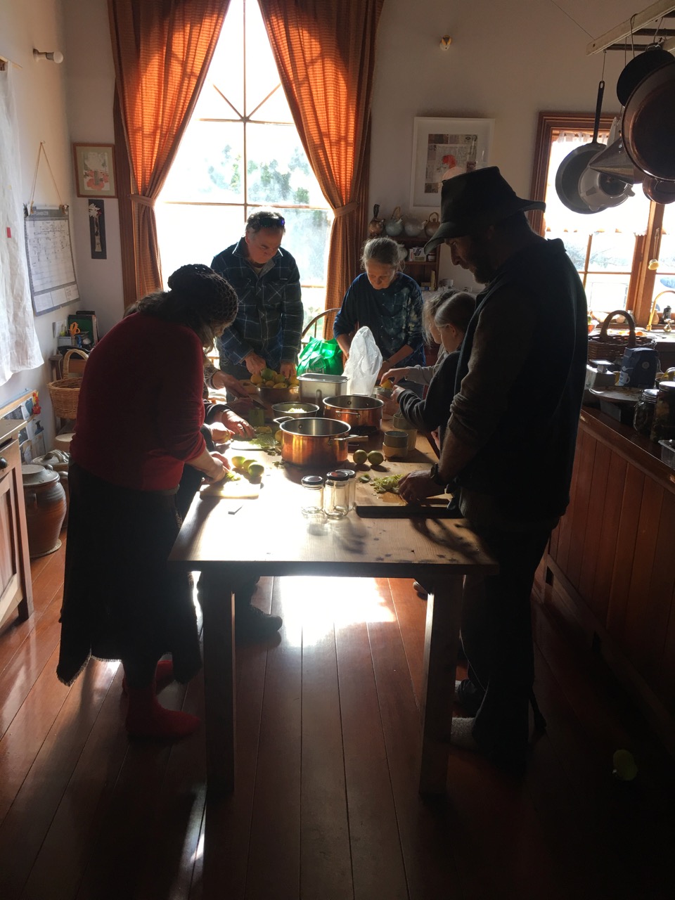 Janine decided to offer a marmalade making workshop to help us use up this fruit productively. All we ask people to do is turn up with their glass jars, so that they can take home their produce, and something to contribute to a shared lunch. We offer to provide everything else. The fruit, sharp knives, cutting boards, sugar, big copper boilers and a couple of citrus juicers.