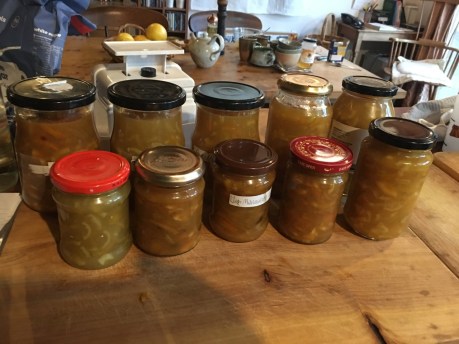 We spend the morning peeling, slicing and dicing. Everyone brings along their own individual approach to dissecting the citrus fruit quite finely, some more finely than others. Janine and I have different approaches and we each demonstrate our own way. We also have two vastly different cooking methods and we prepare batches by both methods.