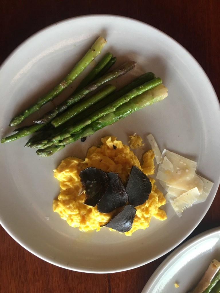 We decided to make scrambled eggs with shaved truffle and some garden fresh asparagus. Perfect!