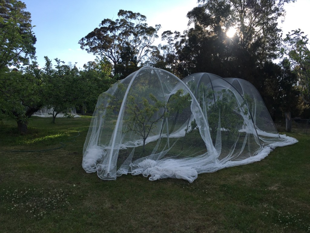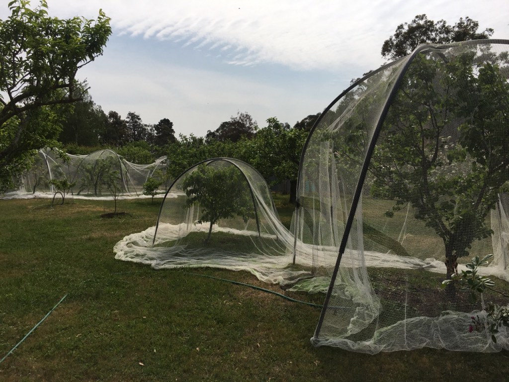 Janine and I set up the plastic pipe hoops and installed the netting over the peach tress in the stone fruit orchard 3 weeks ago as the fruit started to appear. These early peach trees develop their fruit so quickly. They swell from buds in no time flat.