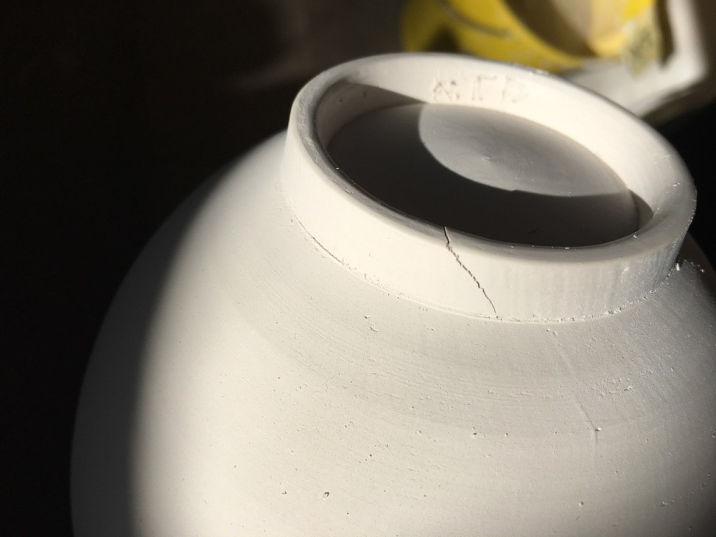 Although sericite isn’t plastic, it still shrinks quite a lot and has a terrible tendency to crack in drying where it is thick. I have developed a few techniques to cope with theses peculiarities. I’ve learn’t to throw everything on batts, as lifting the pot with my fingers causes a memory distortion in the body that shows up later in drying. I’ve learn to ‘polish’ the out side of the clay after I have finished throwing, to seal any possible defects or weak spots that might start a crack during the early stages of drying and stiffening. I have also learnt to turn the bases in stages. Thinning out the clay as soon as it is stiff enough. This stuff can’t be turned like ‘normal’ clay based bodies. It has to be very firm, almost dry to get a smooth finish. If turned too early, it chips and tears, making an awful mess of the fine surface. It’s a bit like cutting soft goats cheese, it just tears.