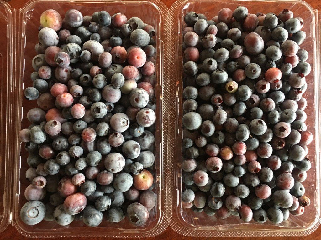Blue berries ripen over time, with only just a few ripe blue ones every so often spread out over all the little bunches. They are quite time consuming to pick. But which fruit isn’t? We have to pluck each individual berry from its neighbour in the tight little clusters. Today we manage 700g in half an hour with both of us at it. I have no idea how they produce these things commercially for just a few dollars per punnet. Slave labour?