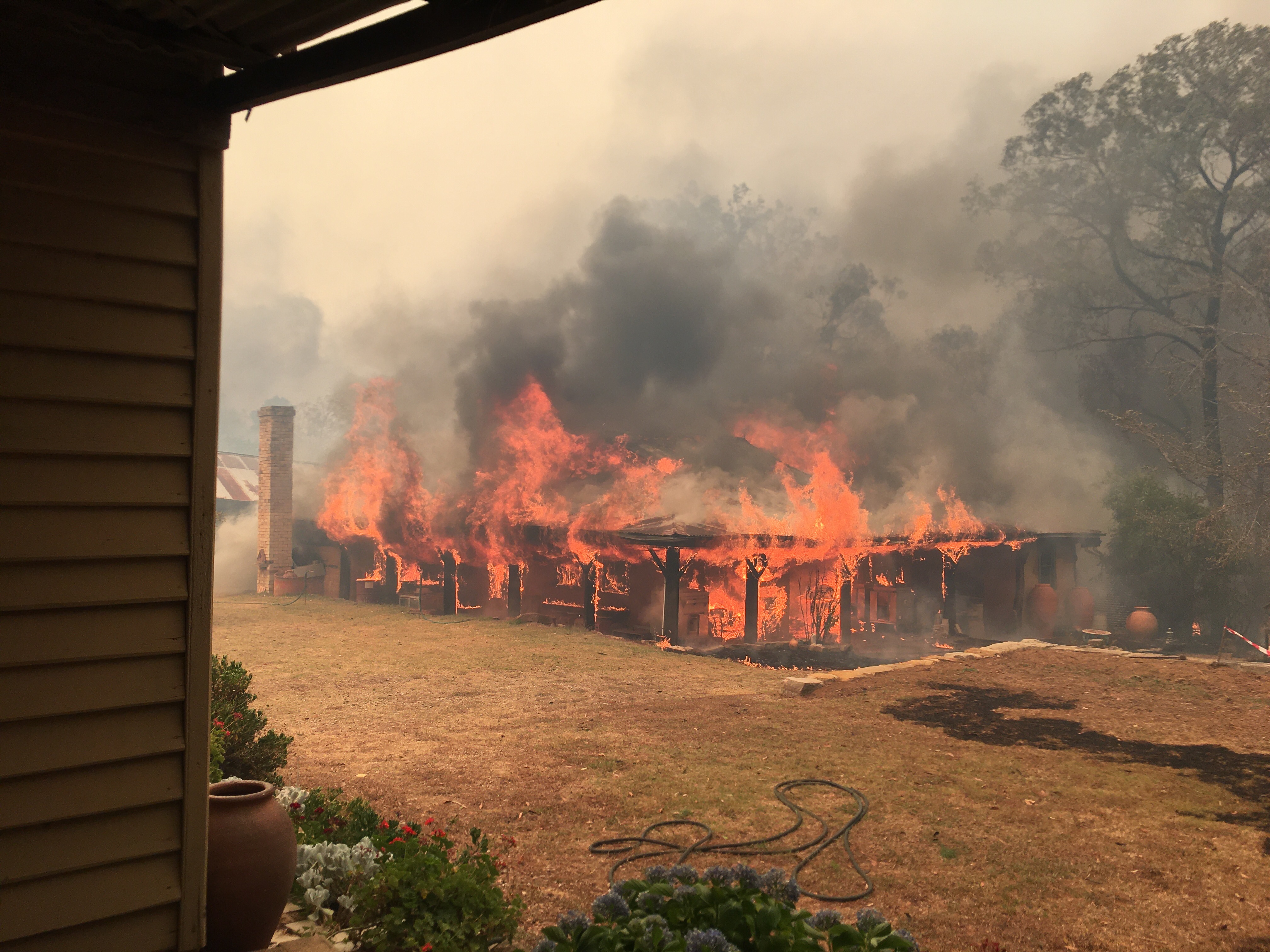 We lost most of our buildings, except our house on Saturday. The fire was too big, too hot, too fast. I had intended to get all the fire fighting sprinklers going on full , then leave when the fire approached. I had the dedicated petrol powered, fire fighting pumps already running on low to conserve both fuel and water. This may go on for several more days.