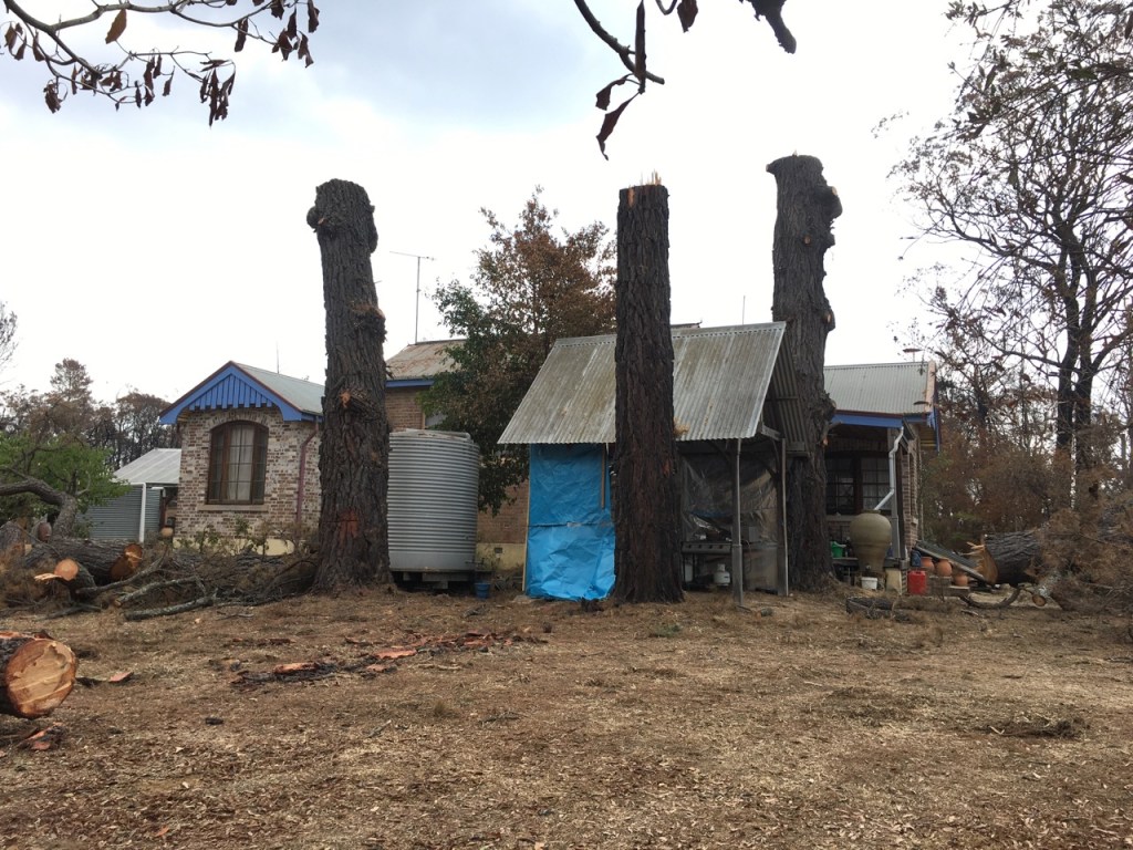 The tree surgeons have been and taken down the 3 big, dead, pine trees that were growing over the house. Pine trees don’t suffer wildfire very well. They don’t recover from fire the way that eucalypts do.