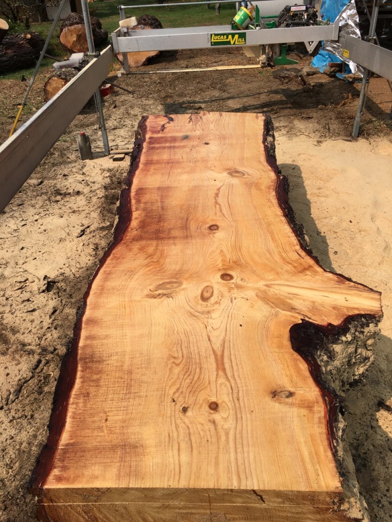 We have spent this 5th week continuing on the long journey of cleaning up this tragic mess. Last week we had the 3 big dead pine trees felled professionally. This week we hired a portable ‘Lucas’ saw mill and started milling the biggest of the pine logs into boards, so that we can incorporate this home-grown and home-milled timber into the lining of our new pottery, when we build it.