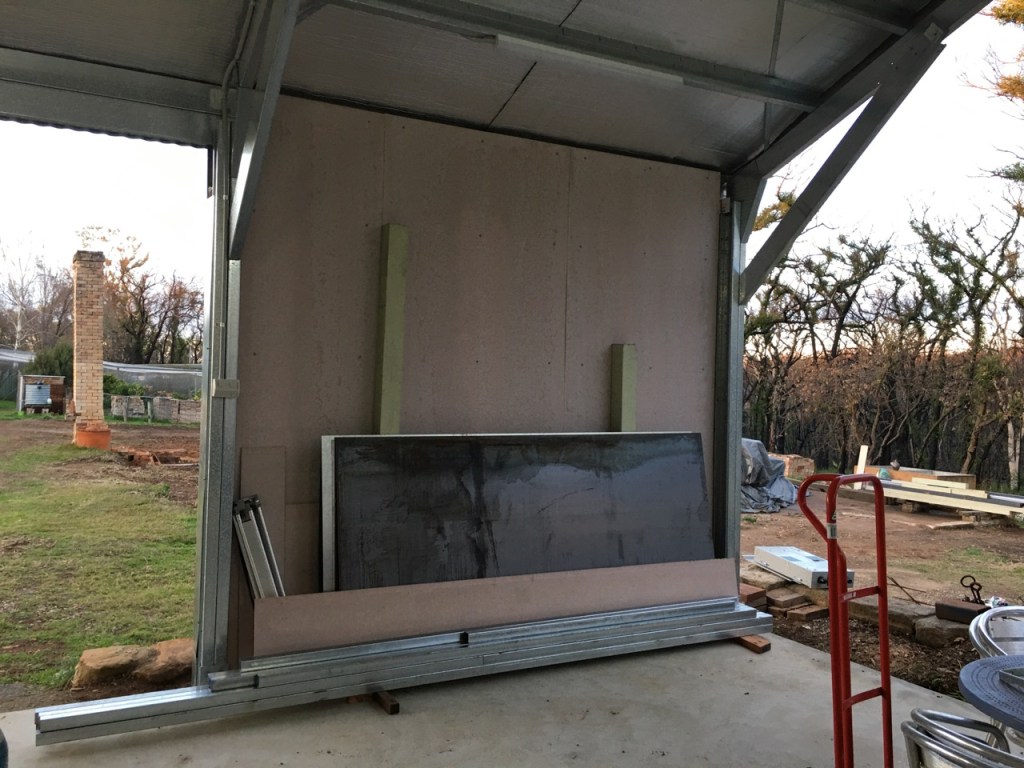 These last few weeks we have insulated the new car port walls with earth wool insulation and then lined the walls with fibre cement sheeting (fibro). I installed it back to front with the textured side out and left it untouched with it’s slightly pink mottled face as the finished surface. It looks OK. I have been trying to make this brand spanking shiney new industrial shed look somehow slightly softened and more comfortable in these rustic surroundings. I think that it’s working. I’m trying to do it without spending very much money either. That’s a challenge.