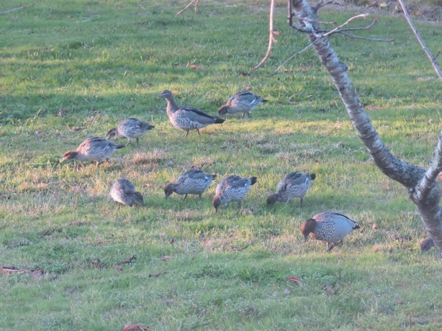 A lovely event this week was the appearance of a clutch of baby wood ducks grazing in the Chekov orchard. For decades, we had wood ducks breeding here in the cherry orchard and on the dams. At that time we had a big eucalyptus tree with a hollow branch hanging over one of the the dams. A perfect breeding site that was used every season by many generations of wood ducks. Tragically, that tree blew over in a huge storm 10 years ago. Since then, the wood ducks haven’t bred here. They are apparently quite choosy about where they nest. Since the catastrophic fire. All the old trees with dead, hollow branches considered suitable by wood ducks as a nesting site have been burnt. Their choices are very limited now. The fire removed all the forest around here. There is no under growth or shrubby nesting sites for small birds, and no hollow branches considered suitable by wood ducks to breed in. So they are not so choosy any more. This pair seem to have lowered their expectations and managed to raise this batch of babies somewhere closer to the ground.