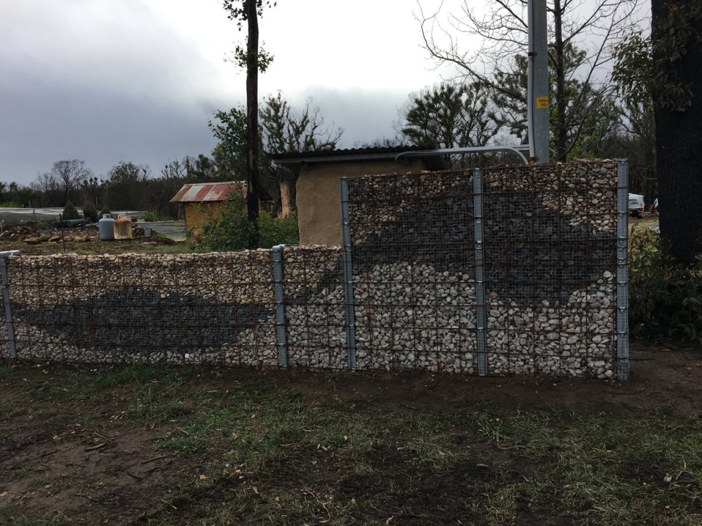 Lastly, we finally finished the north end of the new gabion stone filled wall. I needed to increase the height of the wall where it terminated at the battery shed and the power pole where the Tesla ‘gateway’ and the electrical meter box are located. The gateway and meter box were destroyed in the recent fire, with all the plastic components melted and electronics ‘cooked’.