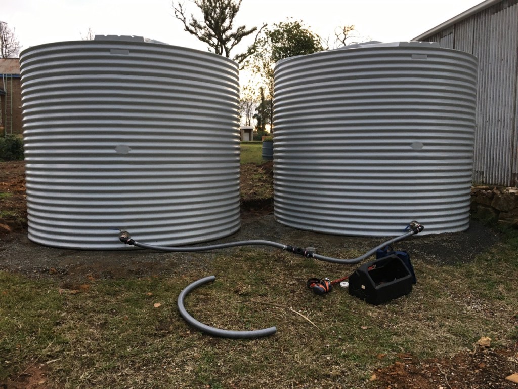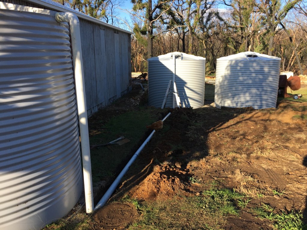 Next, we took delivery of two new water tanks to go on the new shed. These are 10,000 litre tanks, bringing the storage capacity for theses two sheds up to 32,000 litres. Enough capacity to supply a high pressure fire fighting pump for about 4 hours at full volume. I have to install wall and roof sprinklers on these two sheds sometime in the not too distant future, so that we will be prepared for the next catastrophic fire event.