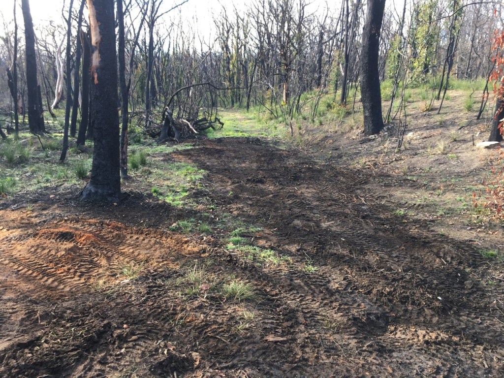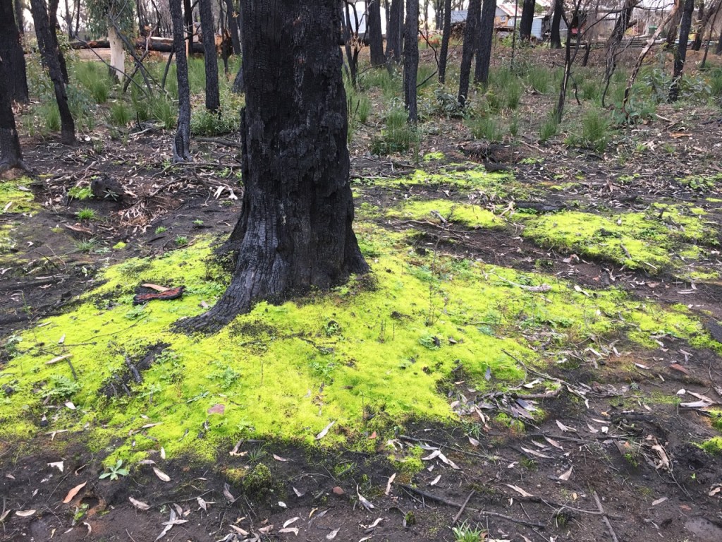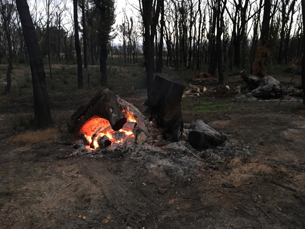 After that effort there were still a number of very large logs and stumps that were beyond me and the efforts that I could muster using my toy tractor/mower. So when Ross came last week with his excavator, we got him to pile all the remaining extra large bits into a big pile and this should be our last big burn. We really need to get this done before the return of the fire bans at the beginning of spring in just a few weeks. I don’t want to have look at this depressing mess for another year. I’m hoping that we will get a bit of rain in spring, and with the warmth we might see a bit of greenery come back. All we have that is green is a few patches of moss or fungus that I have never seen before, presumably enriched by all the ash and nutrient from the fires.