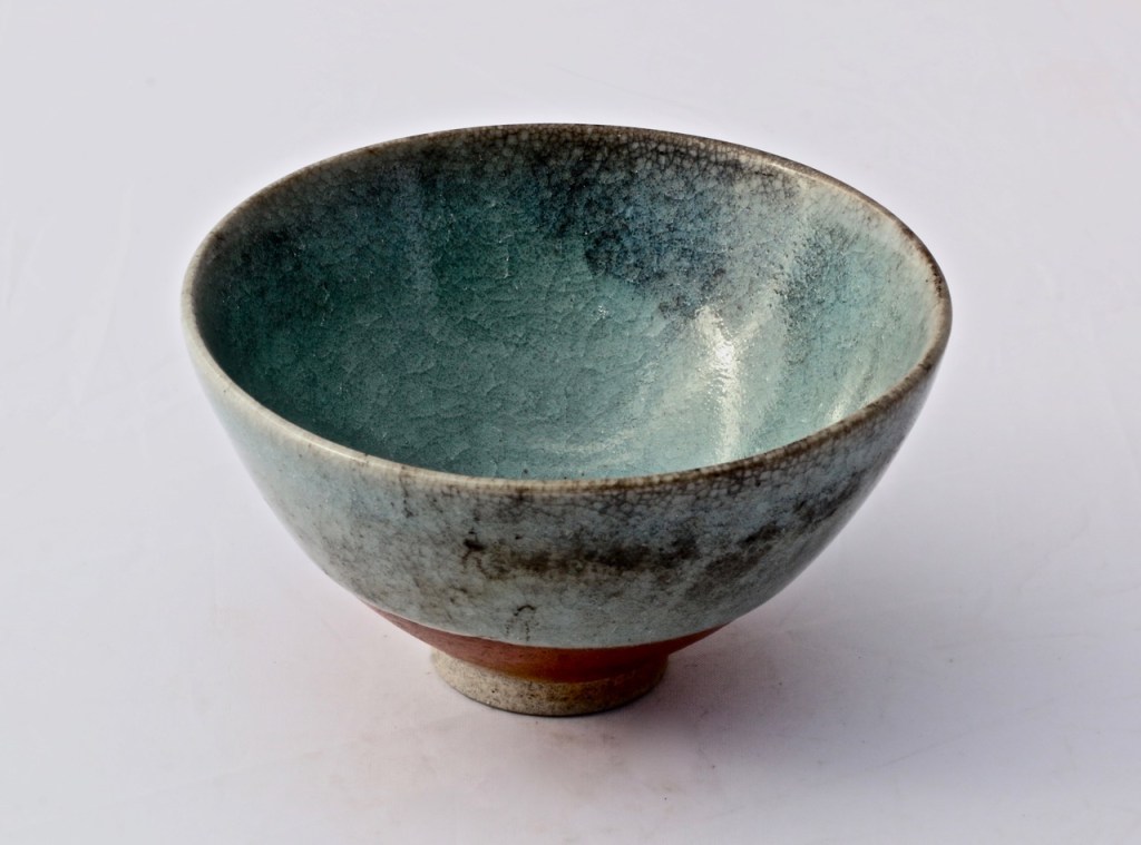 Blue icy crackle glaze with post firing carbon inclusion and sooty patina.