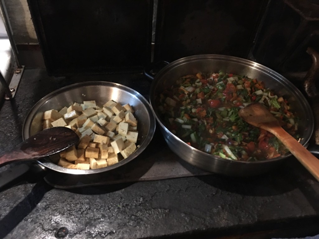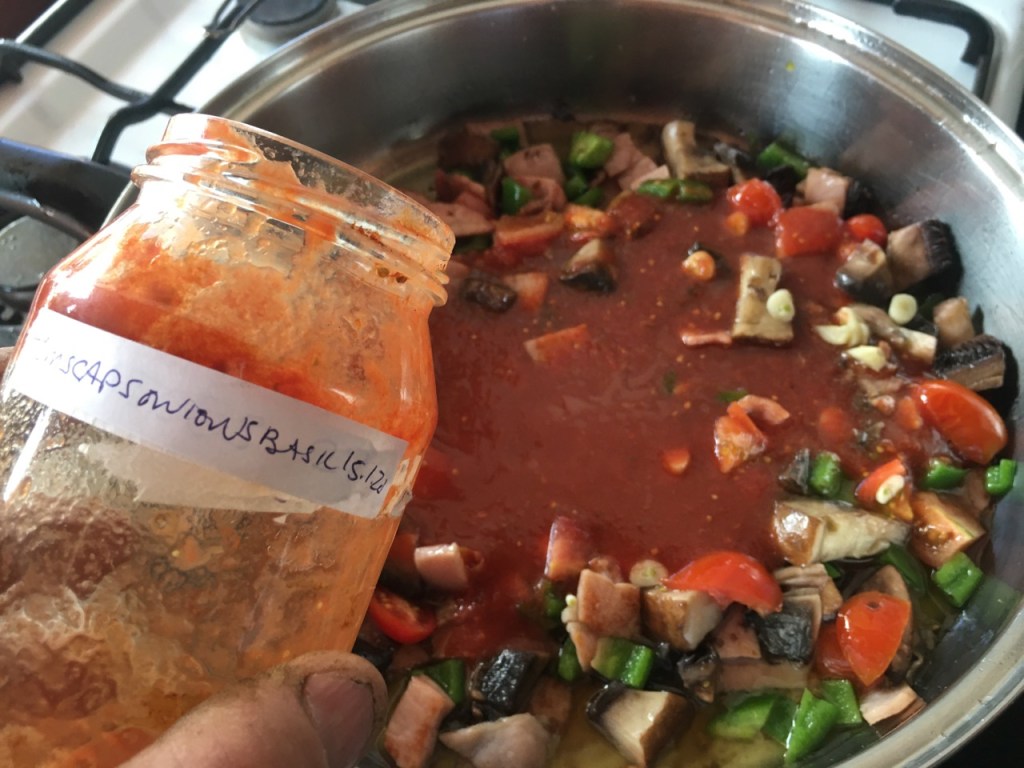 The tomatoes get used in veggie stir fry, mostly vegetarian, sometimes with tofu, occasionally with a small amount of meat. other-times with some chicken and purple Congo potatoes. These are the last of our home grown potatoes. No more now until the new crop. We always cook with loads of our homegrown garlic. Then for a change, with homemade tomato ‘sugo’. This is of course completely out of season, that is why we make it each summer when the huge tomato glut is on . Preserving tomatoes as sugo or passata, gives extra life and ‘zing’ to almost any winter meal. There aren’t sufficient tomatoes in these cold months to make sauce, just enough to add interest in salads and stir frys.