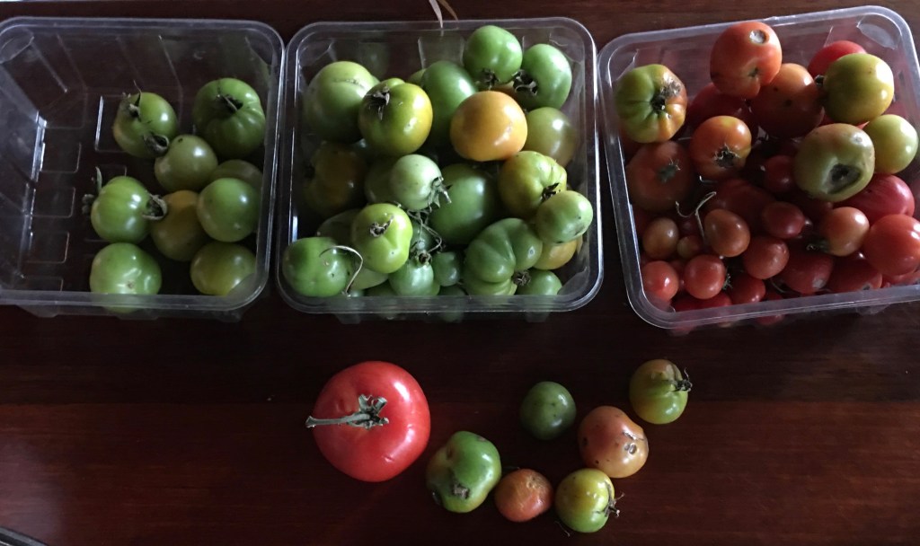 It’s so strange to have both tomatoes, broccoli and cauliflowers in the same basket at harvest in the evening before we retreat inside to cook dinner.