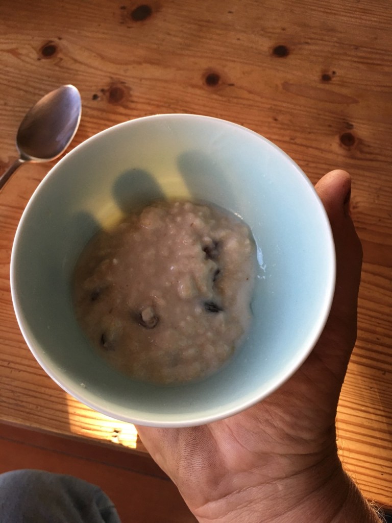 I am up just before dawn. There is a pale glow as the sun approaches the horizon. Shafts of light slant in horizontally through the kitchen window while we eat our breakfast. The pale light strikes my porridge bowl from one side and illuminates the shadow of my fingers through the thin porcelain. It’s a beautiful moment.