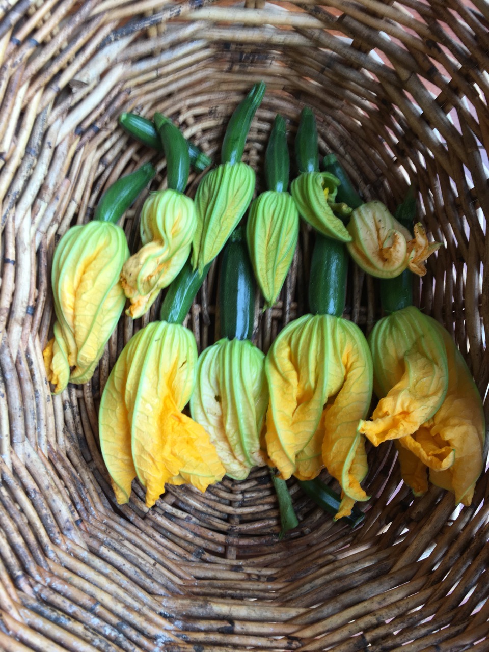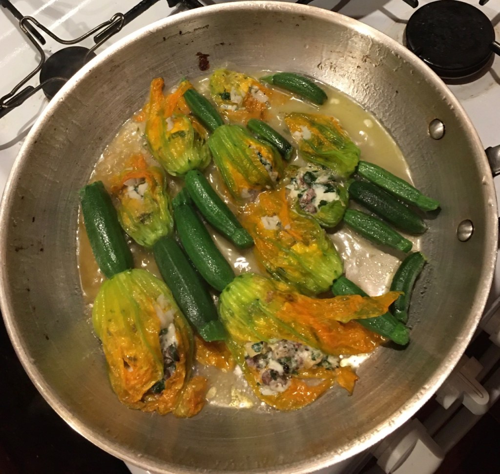 I decided to pick the small fruit with the flowers still on and stuff the flowers with cottage cheese seasoned with a few chopped olives, capers and an anchovie. I fried them in a little olive oil for a minute or 3 and then added a little white wine and put the lid on to steam them for a further couple of minutes. The delicate flowers collapse around the seasoned cheese stuffing, while the fruit remains firm, but heated through. The flavour is very delicate and the texture matches perfectly. Our first of many such meals this season.