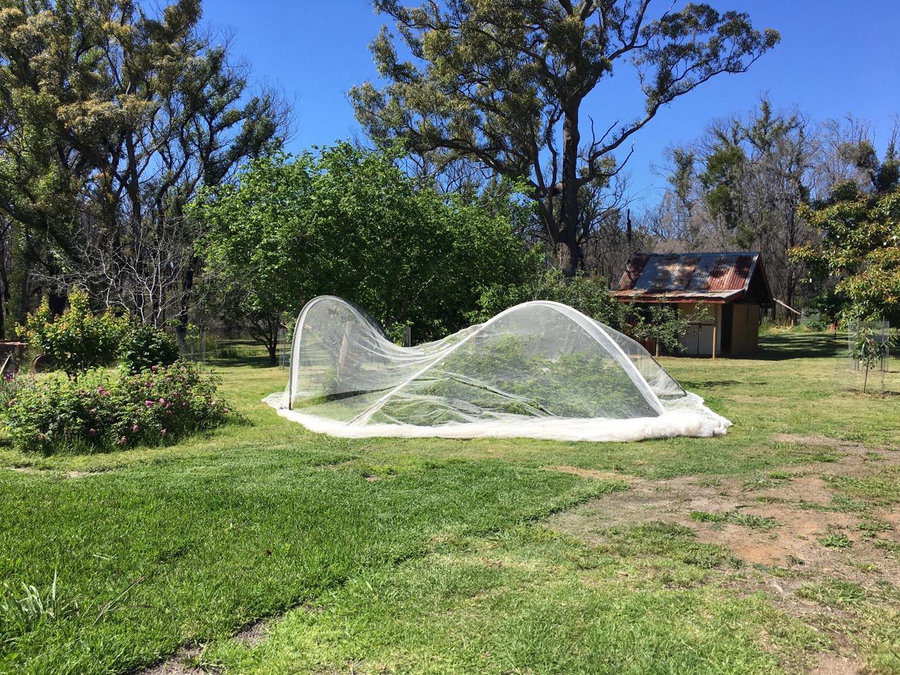 So now we have to say the first young berries of the season, because it’s nearly all over in the late spring. We only have to put put one net up this year, as all the other fruit trees are either burnt , or badly damaged and cut back very hard to remove the damaged wood, so there will be no cherries or peaches, no apples, pears or plums, no avocados. Just the youngberries. They survived the fire because they were directly behind the house. I am grateful for what I have.
