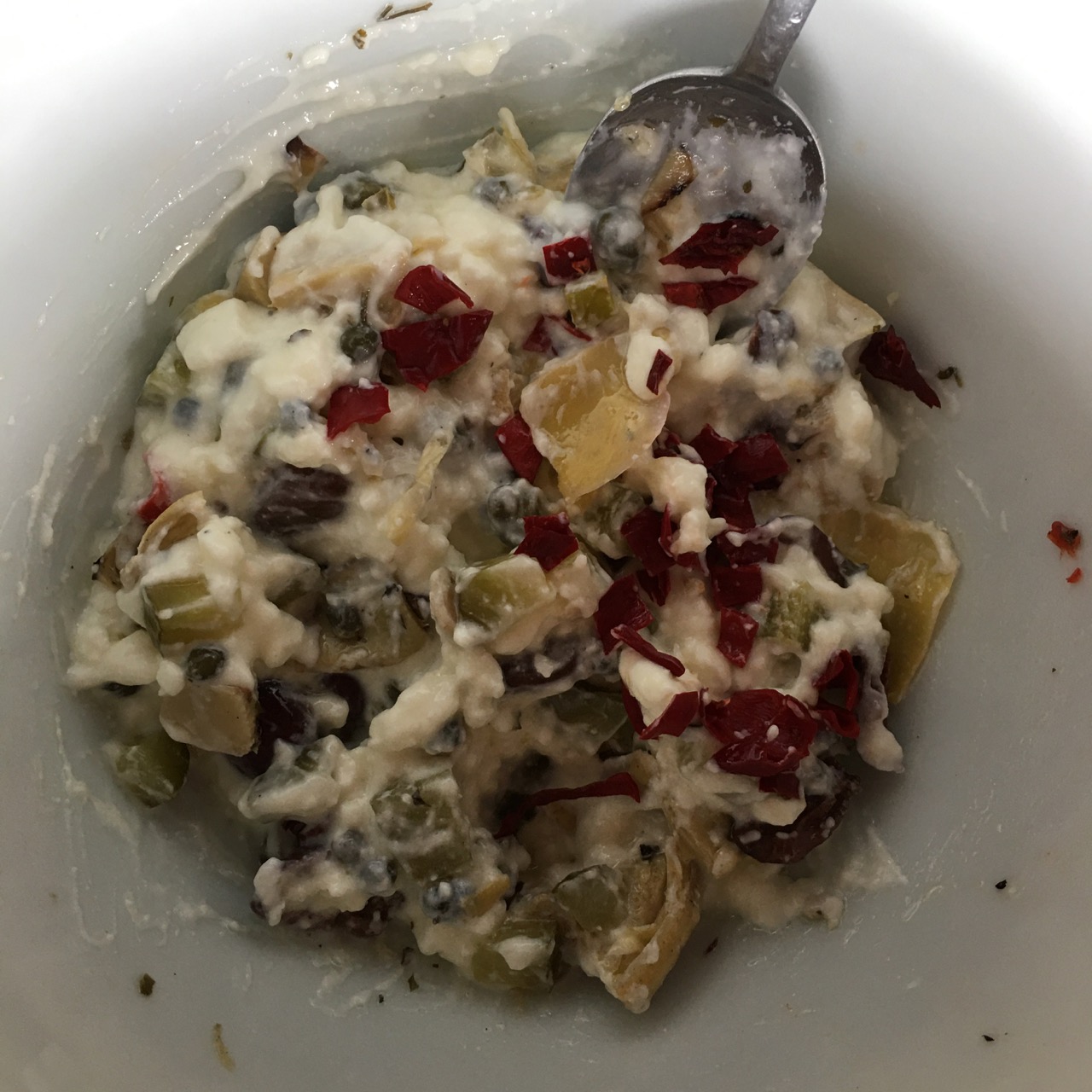 So what’s in the stuffing? I like to mix cottage cheese or ricotta with any or all of the following; chopped garlic, chopped olives, chopped up dried tomatoes, preserved artichoke hearts, split and diced into smaller bits, capers, a diced chilli and perhaps even some finely diced chorizo. I also sometimes add sage or thyme leaves, even preserved capsicum section. What ever you have in the fridge or pantry. Give it a good stir and spoon it into the flowers. Squeeze them closed onto the stuffing and place in a wide pan with a little olive oil and a dash of white wine. cover and steam them for 6 minutes.
