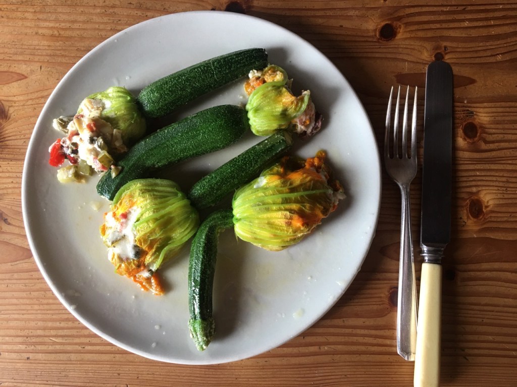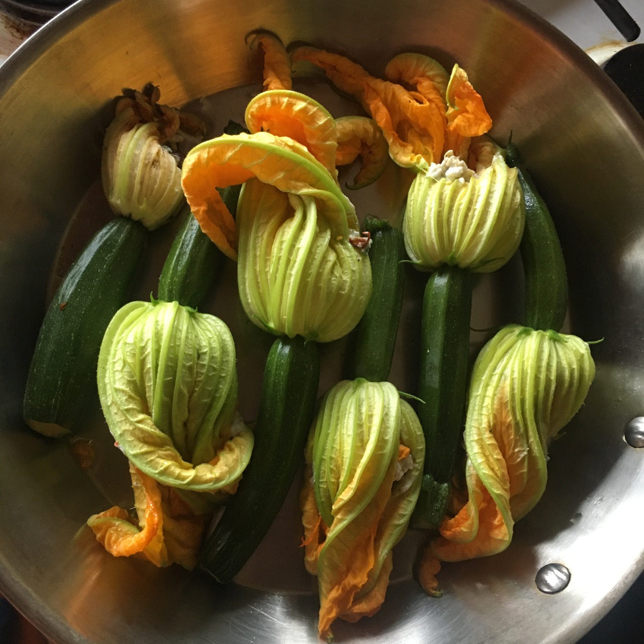 This results in the zucchinis being just cooked, sort of firm snappy fresh, but heated through. The filling will have cooked together into an homogenous mass inside the flower, which will have wilted completely. I don’t use salt. There is quite enough in the preserved veggies, but a grind of pepper is nice.
