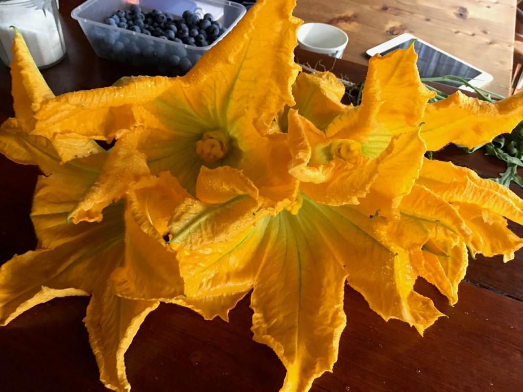 Now that the new crop of zucchinis is starting to produce in earnest, we are able to pick half a dozen small, day old, or even just hours old, flowers with small fruit attached every morning. So we are enjoying the experience of stuffed zucchinis every second day.