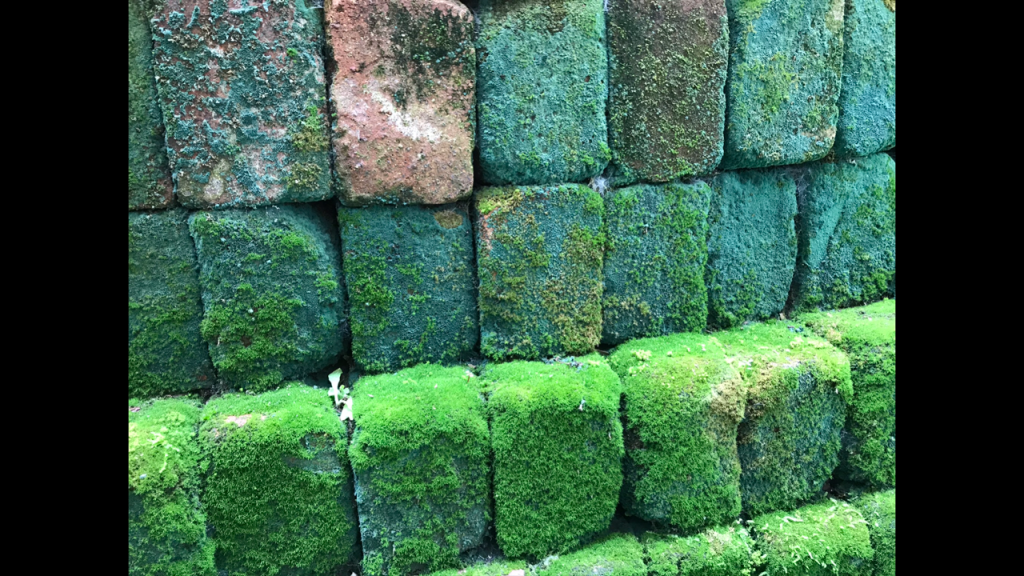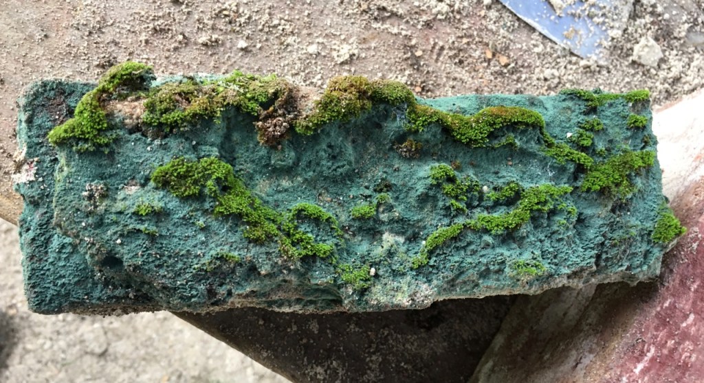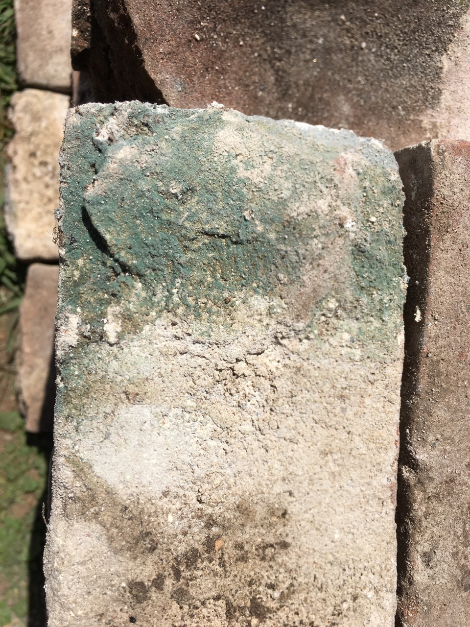 We came across a really lovely example of the blue mould on one brick, with some green moss. I sent a photo of it to my friend Warren. He sent back an image of a pile of his bricks that are a stunning example of both the blue mould and bright green moss.