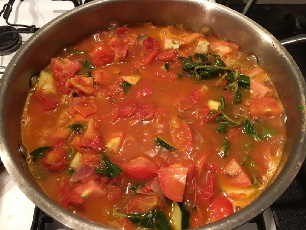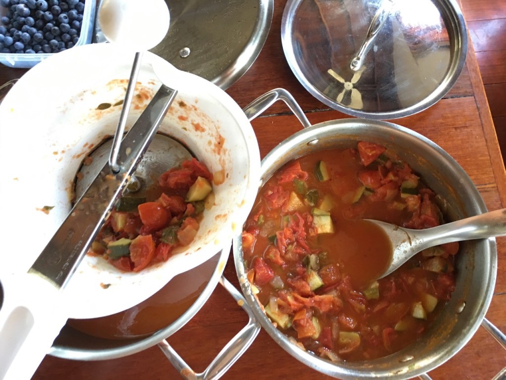 I simmer this for 20 mins or so until it all softens and then lid on and put it aside while we cook dinner, and leave it to cool overnight. The next day, before dinner. I pass the whole lot through a mouli sieve and then re-heat it to reduce the sauce to concentrate it down to half its volume.