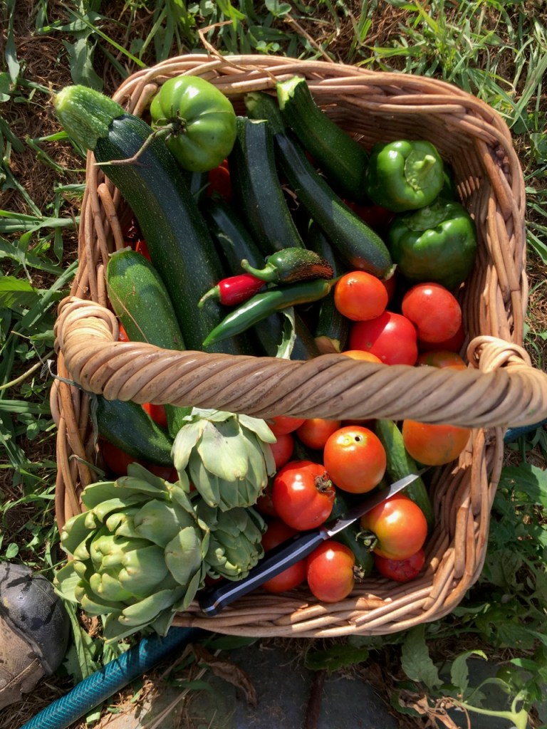 Last nights passata bottles and this mornings pick of zucchini flowers, this will be dinner. Plus baskets of more tomatoes, chilis, capsicums, artichoke hearts and cucumbers.