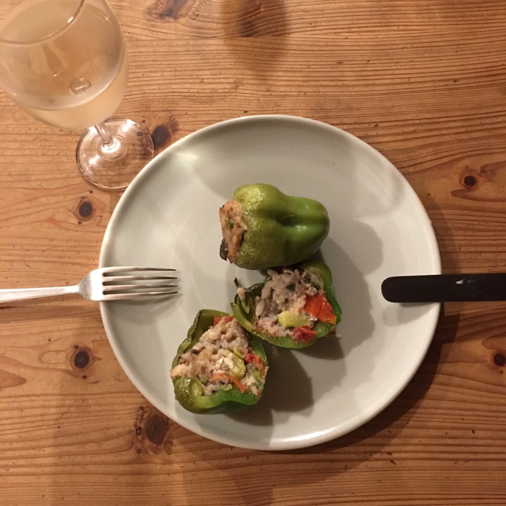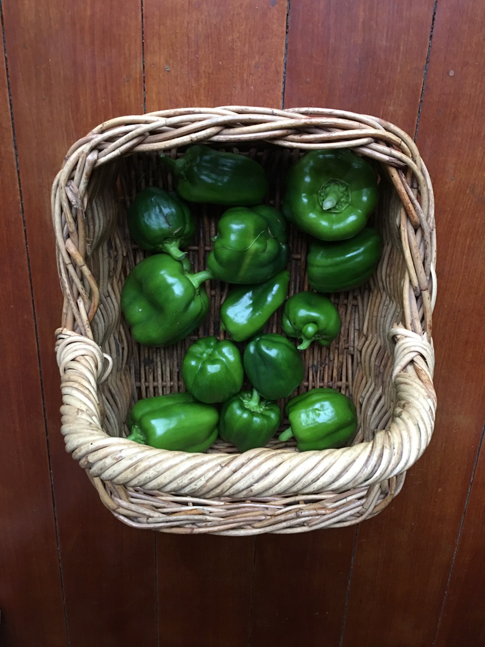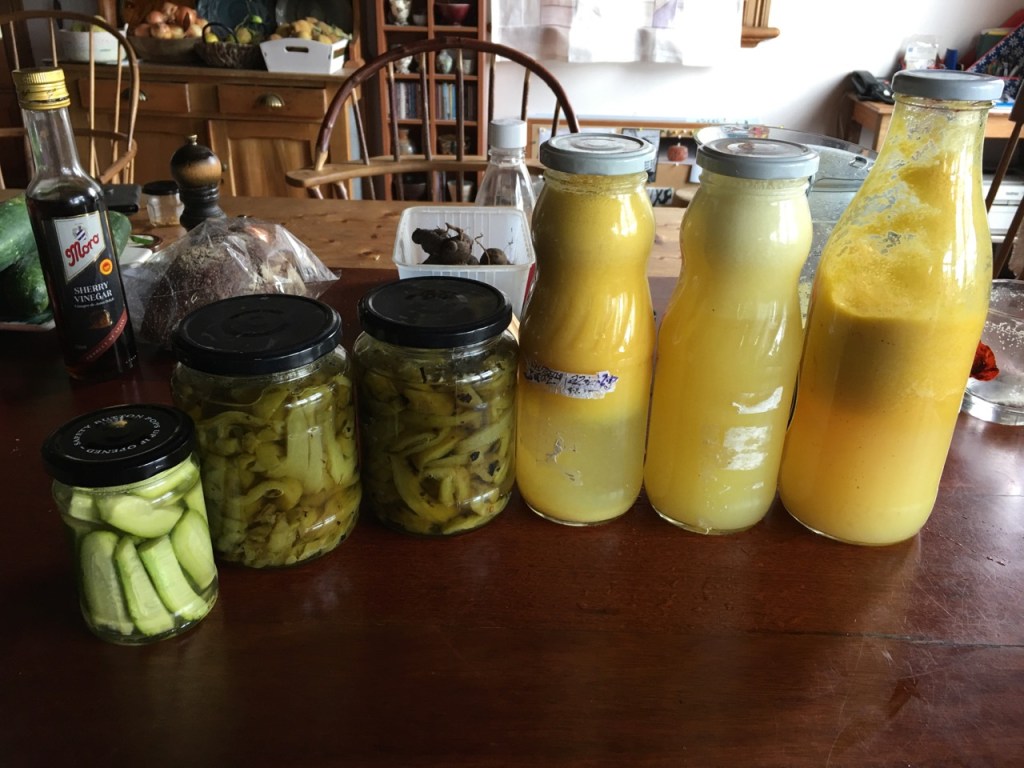 Geordie called in, so he helped us roast and bottle peppers in oil, cucumbers in saline, while Janine made orange juice.Then stuffed capsicums for dinner, with marmalade for breakfast.