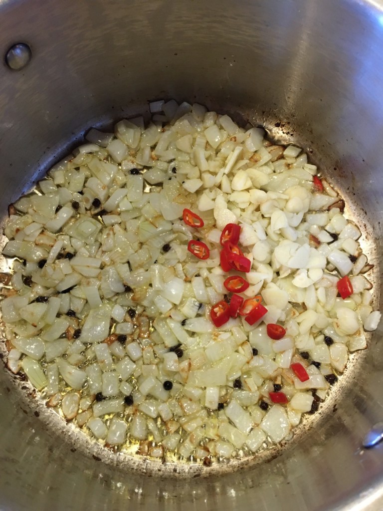 I start by browning onions in olive oil with pepper corns and chilli, then as the sauce pan fills, I add in the herbs and bay leaves.