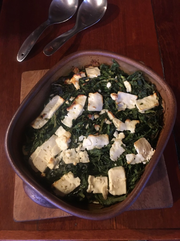Spinach, capsicum, zucchini, onion, garlic, and potato slices baked in the oven in a tomato passata sauce. We just happen to have all these ingredients in the garden and a bottle of home made passata in the fridge just now. The only thing that is purchased is the feta cheese.