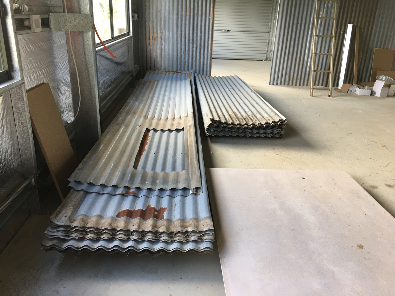 I’m very lucky to find such lovely old weathered, matt grey and slightly rusty material. It’s just what I really like. Most of these sheets will line the walls of my metal working workshop, which is over 4 metres tall, just right. Some of the other rooms will benefit also with the kiln room and the gallery getting a wall or two also. I’ll have to wait and see how far it all goes, as there are always losses in cutting the sheets to fit the size of spaces required.