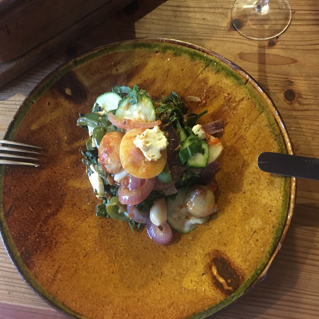 In the evening Janine makes a fabulous dinner of garden veg with a little bit of feta. She was watching A TV show about cheese making and the presenter explained that this was a local recipe from Greece. She thought that it sounded interesting, so wrote down what she remembered after the show. So there is immediately a little bit of interpretation and creative adjustment going on. Whatever was originally intended doesn’t really matter, as this works aa treat.