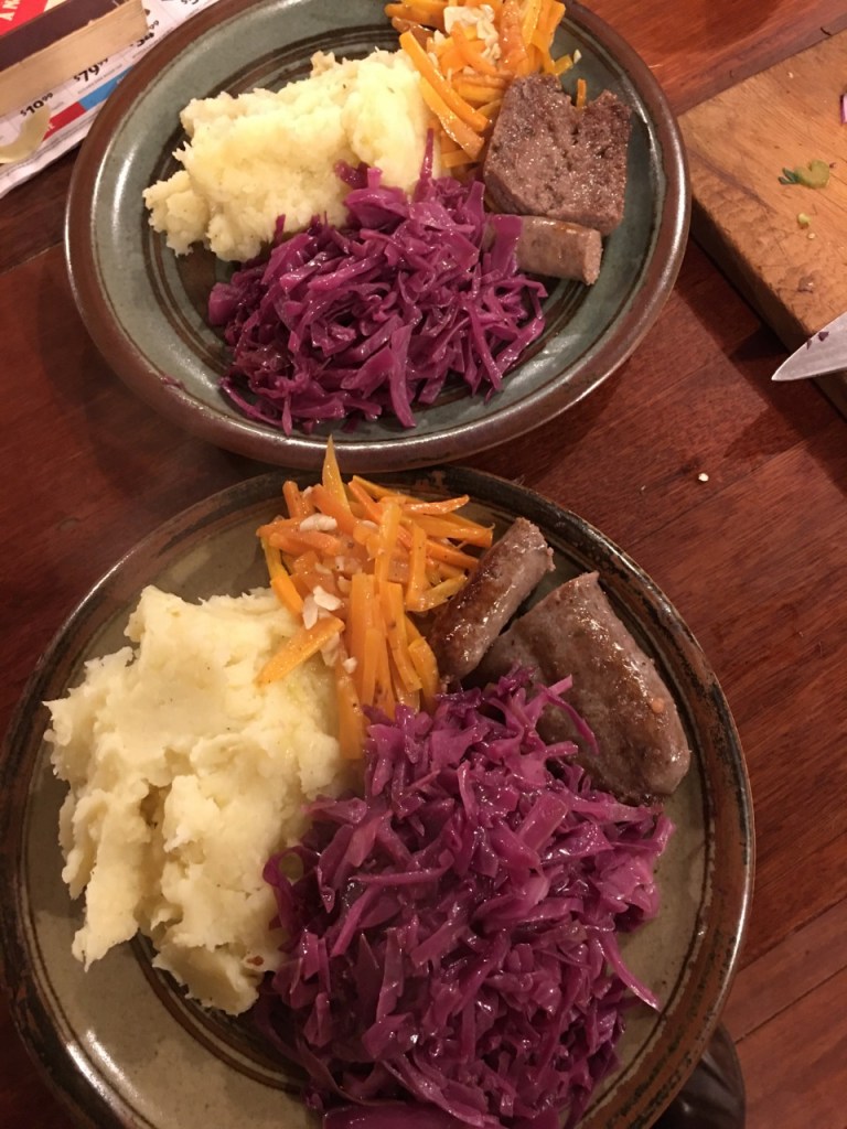 I saw some nice bratwurst and also some pork mushroom and garlic sausages at the local butcher. I bought one of each and we shared half each, cooked with parsnip and spud mash, red cabbage and julienne carrots with garlic. Sausages are not very healthy food, they are stuffed full of salt, fat and preservatives, so I rarely buy them. The only time I eat a sausage is over at the Village Hall at the occasional fund raising get together event. So buying a sausage was a quite unusual event. I can’t remember the last time I bought a sausage from the butcher. It must be two or three years.