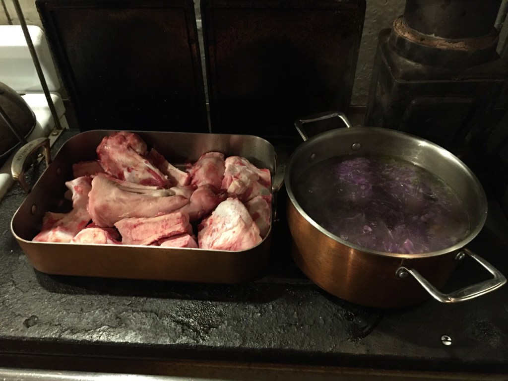 The browning the marrow bones on the stove top, sharing the hot plate with Janine’s Minestrone.