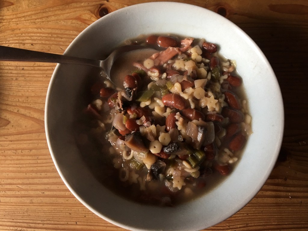 Janine’s minestrone made with our summer harvest of dried beans and our vegetable stock base. The only purchased item was the alphabet pasta, left over from a kids meal.