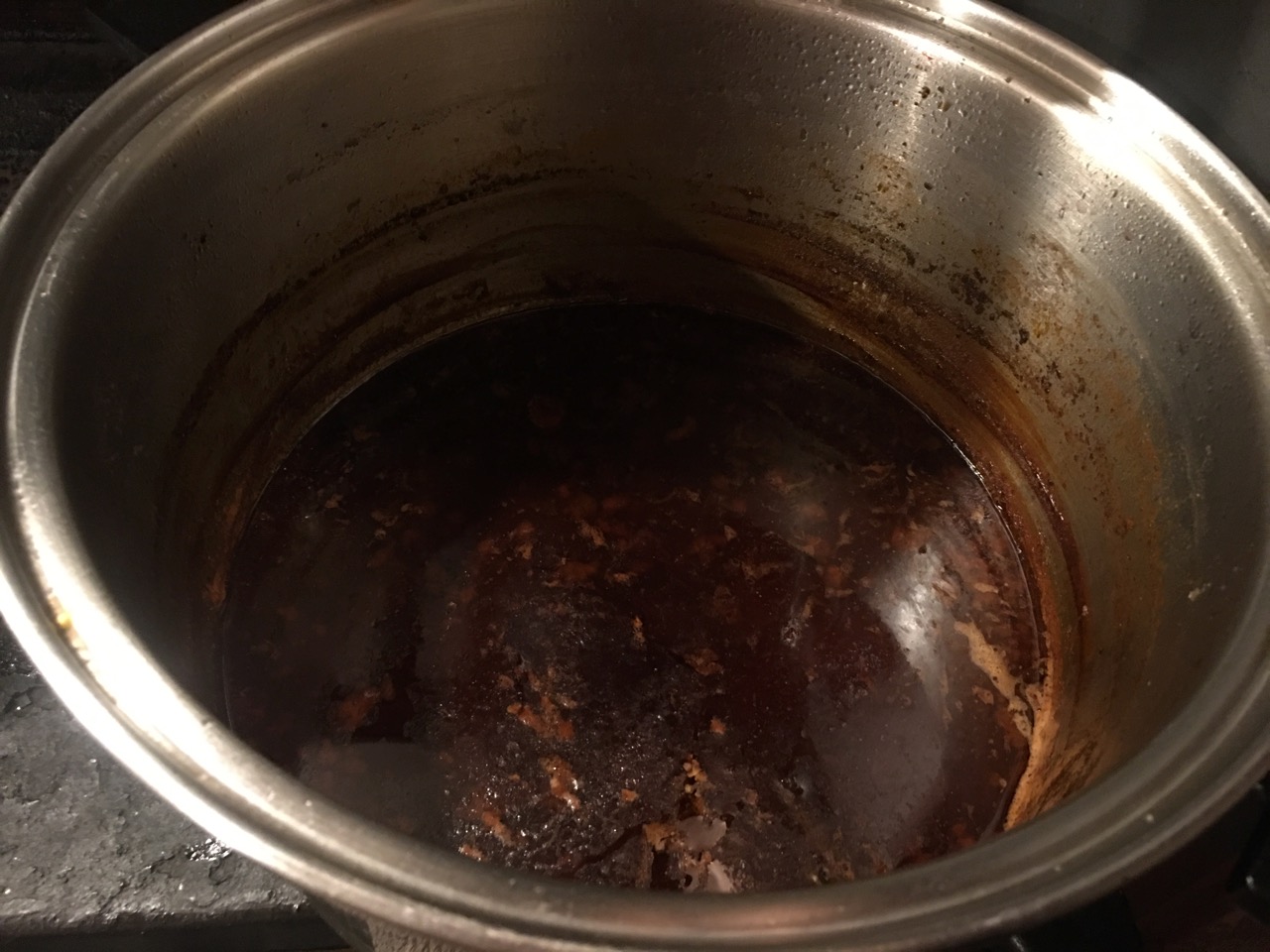 You can see the various tide line levels on the side of the pot, as I simmer it down from three large boilers of 5 litres each, all reduced down to fit in this one pot and then reduced again to just 600 mls of jellylike concentrate. A spoon full of this flavour bomb, is a home made stock cube substitute, only better, being low salt.