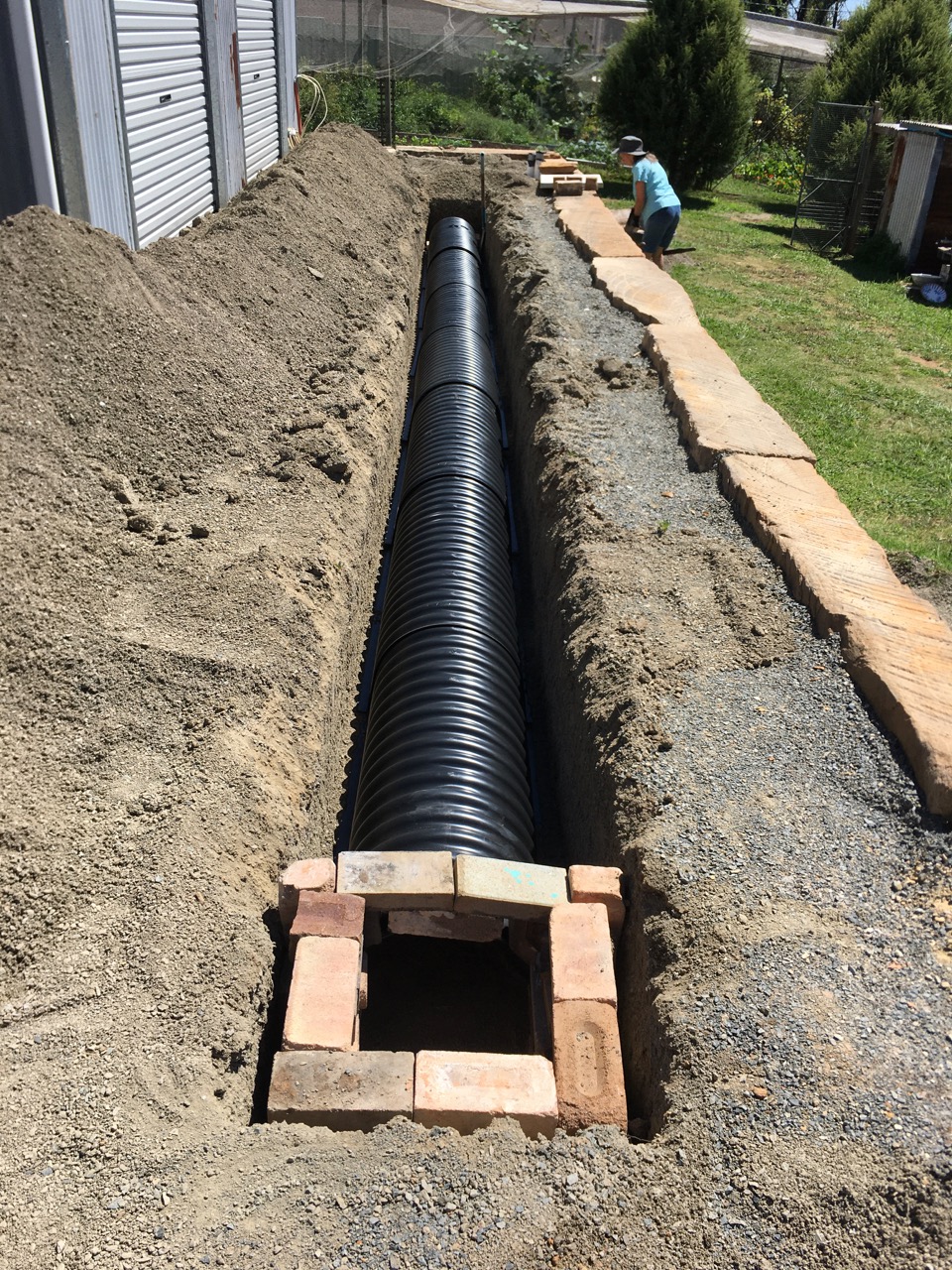 There are still a lot of small jobs remaining that we have to complete before we can call the Council Building Inspectors and apply for a final inspection. We need the final inspection to get our Occupancy Certificate, then we can be potters again instead of being stuck in this perpetual builders labourer mode. One of the main jobs on the list was to bring water down form the big new water tanks up near the street in front of the barn down to the pottery.