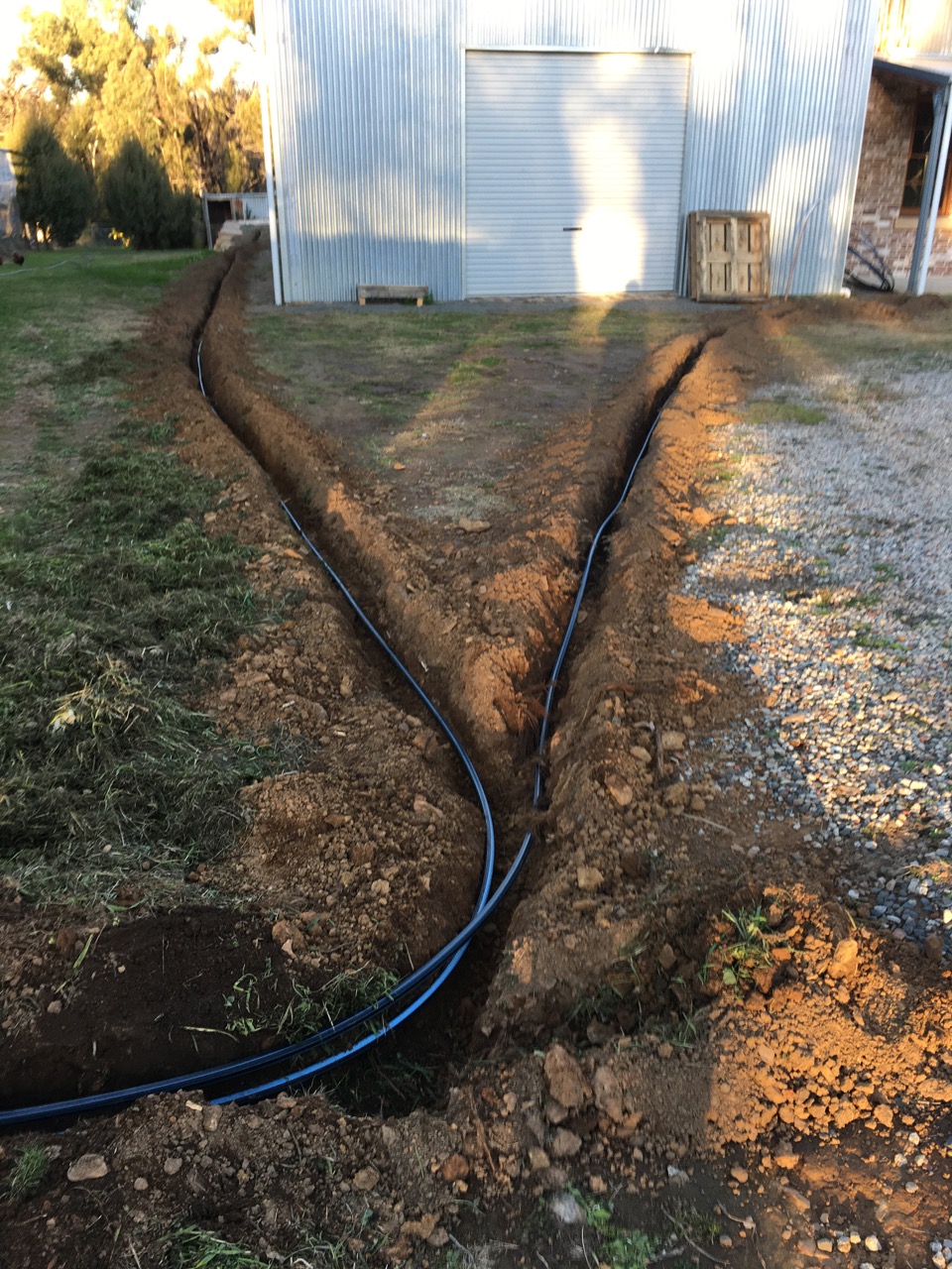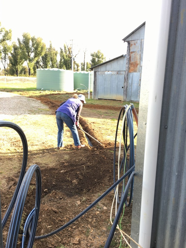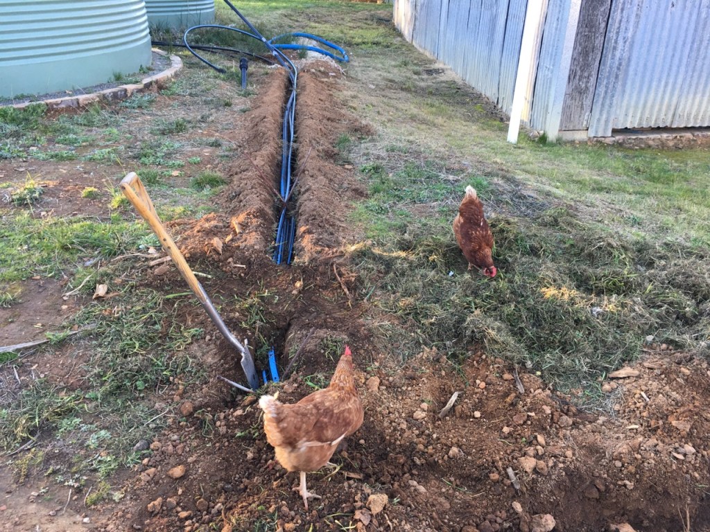 We are lucky that have very good friends who have a half share in a trench digging machine, so I asked to borrow it for a day last Saturday. It’s a fantastic gadget. I was able to dig the 100 metres of trench in a little over 2 hours. I hit a lot of flat iron stones that are very common in this soil. They sit horizontally in layers not unlike shingles, so digging through them is quite an effort with a mattock and crow bar. The last time I did it manually to do a short 11 metre trench for some storm water pipe on the barn, it took me most of the day, and I ended up digging a trench 300 mm deep x 300 mm. wide flaring open towards the top as I prised out the multiple pieces of flat stone. I only need to bury 9cm. pipe, but the hole was more like the Suez canal!