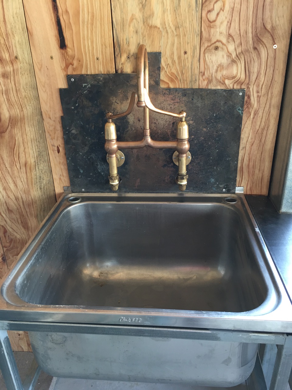 I spent the best part of a day straightening it out and hammering it flat. Well, as flat as I could get it. I gave the centre part a bit of a polish to show that it really is brass, and left the rest with its fire-scarred patina. It makes a suitably steam punk splash-back for the ancient taps.