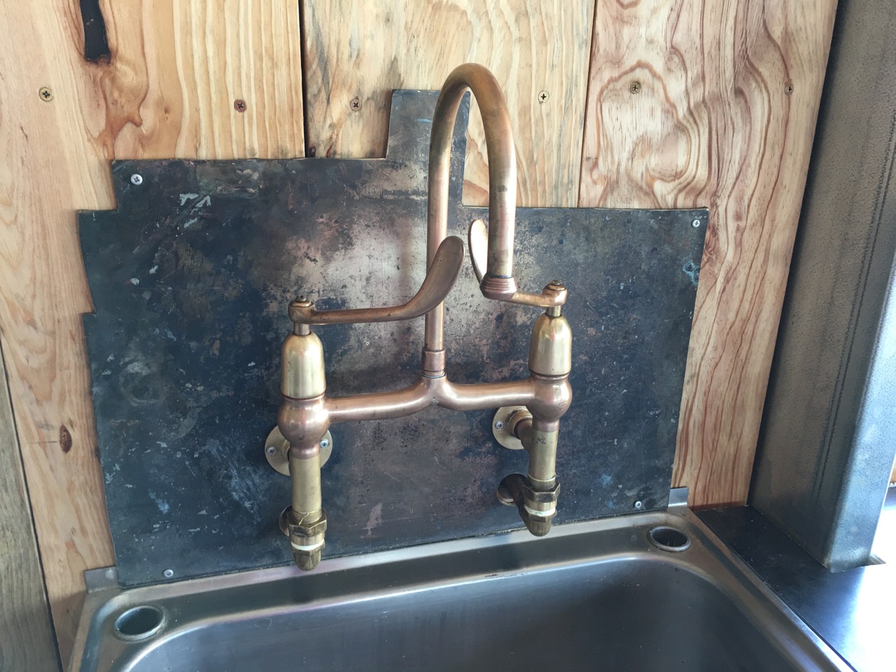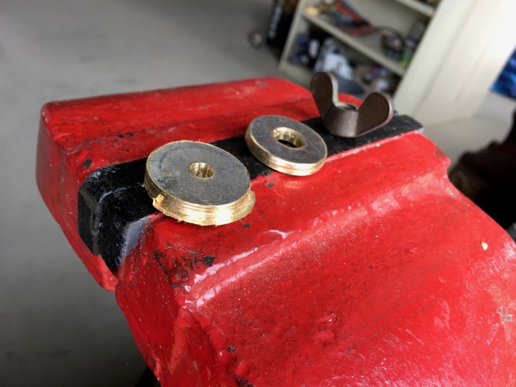 I made a couple of brass washers from the ‘hole’ pieces that I cut from the pottery sink splash-back to get the water pipes into the shed.