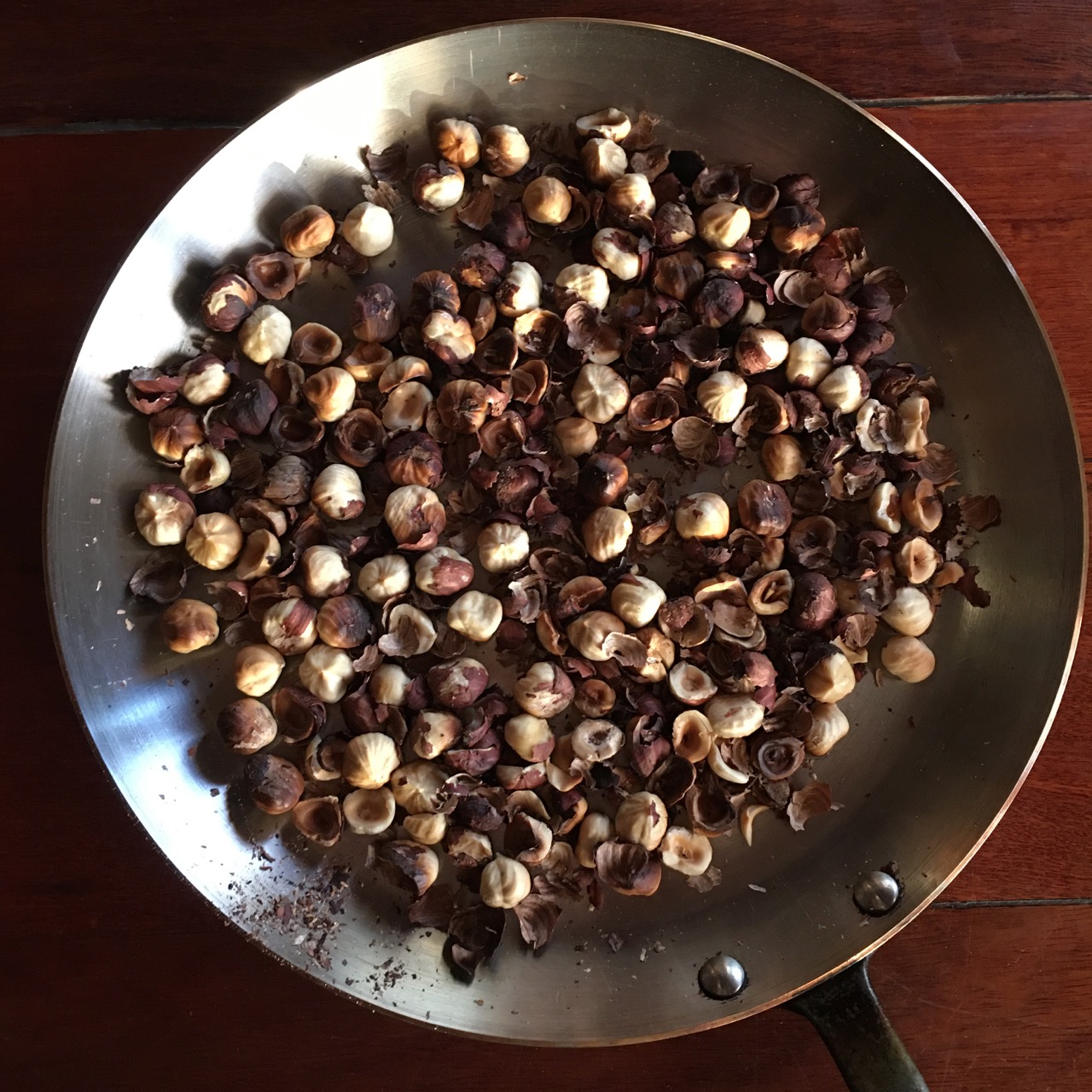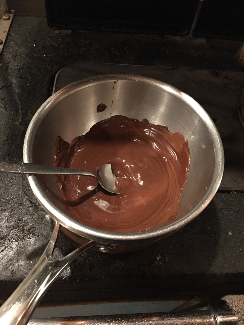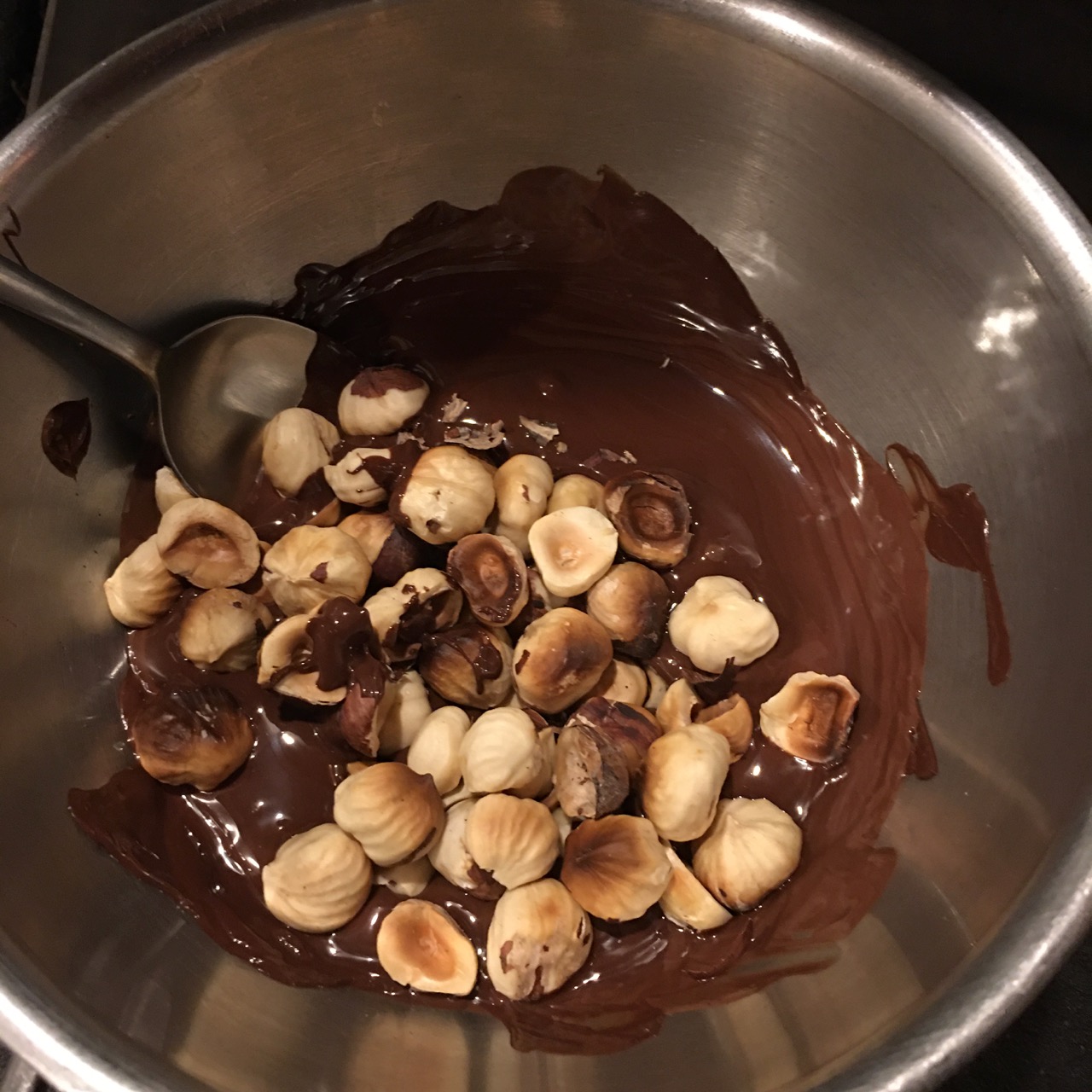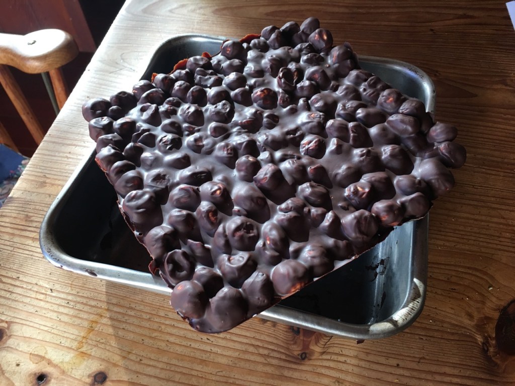 This two piece cake tin concertinas inside itself, so it is always the perfect size for almost any size recipe. While Janine was making her cake, I roasted hazelnuts under the grill, just enought to bring out a little colour and that amazing smell and flavour.We had spent the few nights prior in front of the idiot box shelling the nuts. I melted 2 blocks of cheap, no-frills, German, organic, supermarket 70% dark chocolate in a double boiler, made from a bowl suspended in a source pan of boiling water, I mixed the nuts into the melted chocolate, then poured the mass out into a square cake tin to cool. It is so amazingly delicious, tasty and fragrant, but not sweet, just nutty, melt in your mouth smooth, but with that special freshly roasted hazelnit crunch. Wow! We may not have any money, but we live a rich life. Imagine trying to buy this at DJ’s food hall?