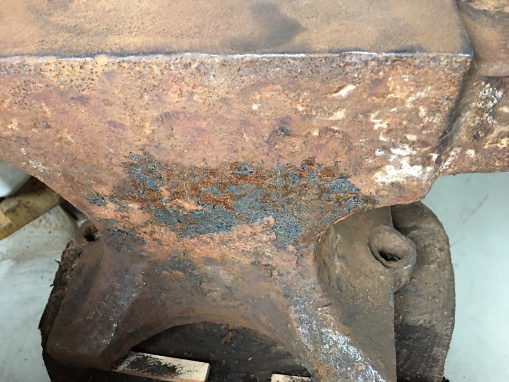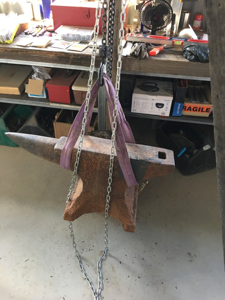 The next day, back in the pottery, I retrieved the anvil that had been through the fire and then sat out in the yard for 21 months waiting for some TLC.It should have been rescued much earlier, but I’m working to my limit and I don’t want to overdo it. I can’t do everything. So now is the time to retrieve the anvil. It is the worse for the weather even though I had it tarped, but fire does strange things to iron, and it rusts so much faster than if it had just be put outside. I cleaned a lot of flakey rust off the surface and then treated it with rust converter to stabbilise it. I remember when I bought it back in the 70’s, at an auction for $110. I was so much younger and I could lift it into the VW beetle back then to bring it home.I must have been mad! It’s somewhere around 100 kilos, if not more. I can’t lift it now!I had to use the little crane on my truck to pick it up, and then build a tripod and use a chain block to lift it onto its new block. It’s a thing of beauty and a joy forever! This anvil has an English maker’s stamp on it. I imagine, sometime in the 1800’s?