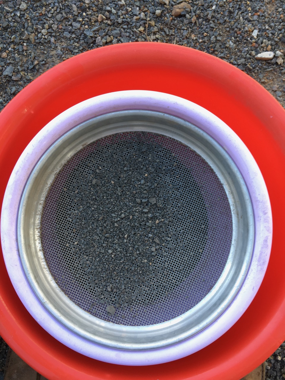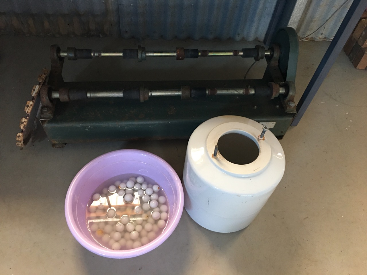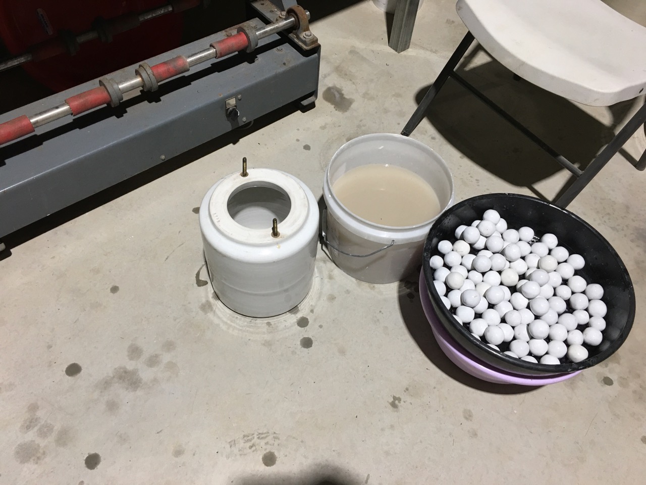All the jars needed to be washed out and cleaned, then filling with balls and water and run for an hour or so the get the surface of the balls and mill all clean and fresh to start work. After milling like this the water turns cloudy, so the balls are rinsed in 2 buckets of fresh water, then placed in a plastic garden sieve to drain and dry out.